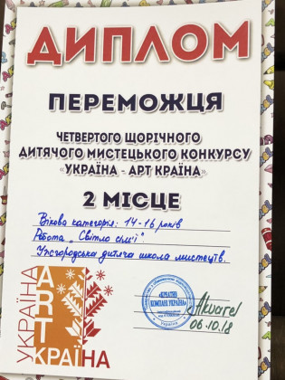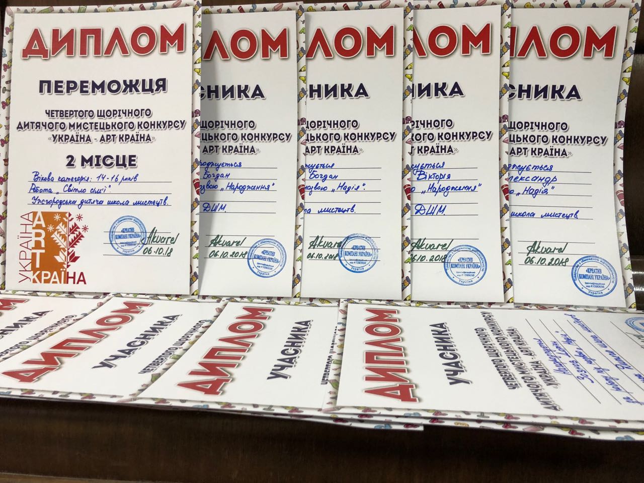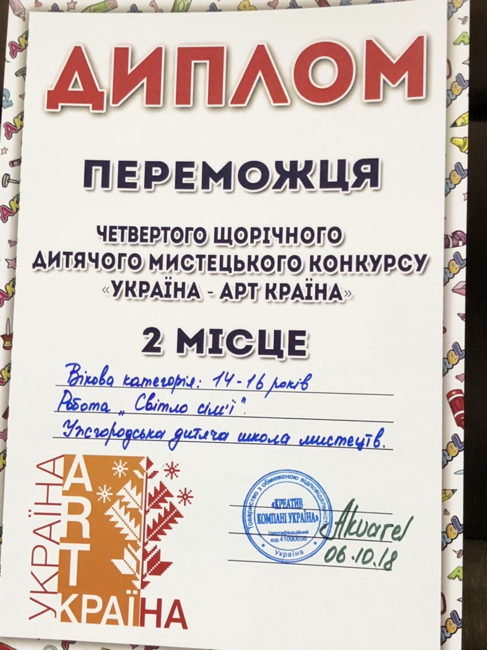 10 учнів відділення образотворчого мистецтва Ужгородської дитячої школи мистецтв 1-6 жовтня на Четвертому щорічному дитячому мистецькому конкурсі «Україна – Арт Країна» у Києві здобули ІІ командне місце у віковій категорії 14-16 років.