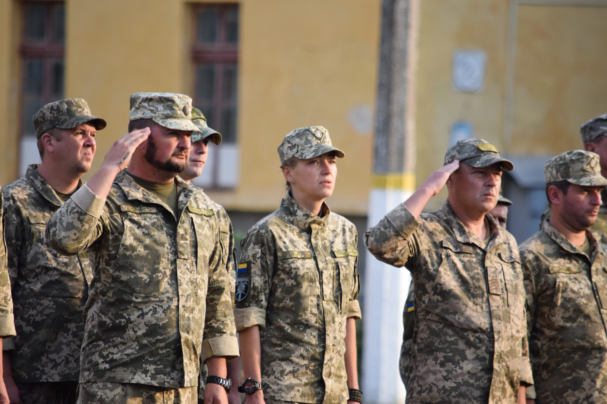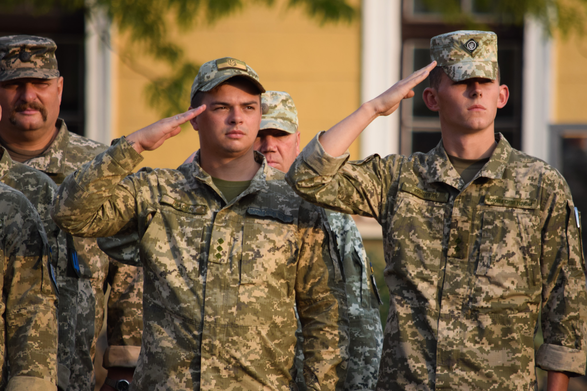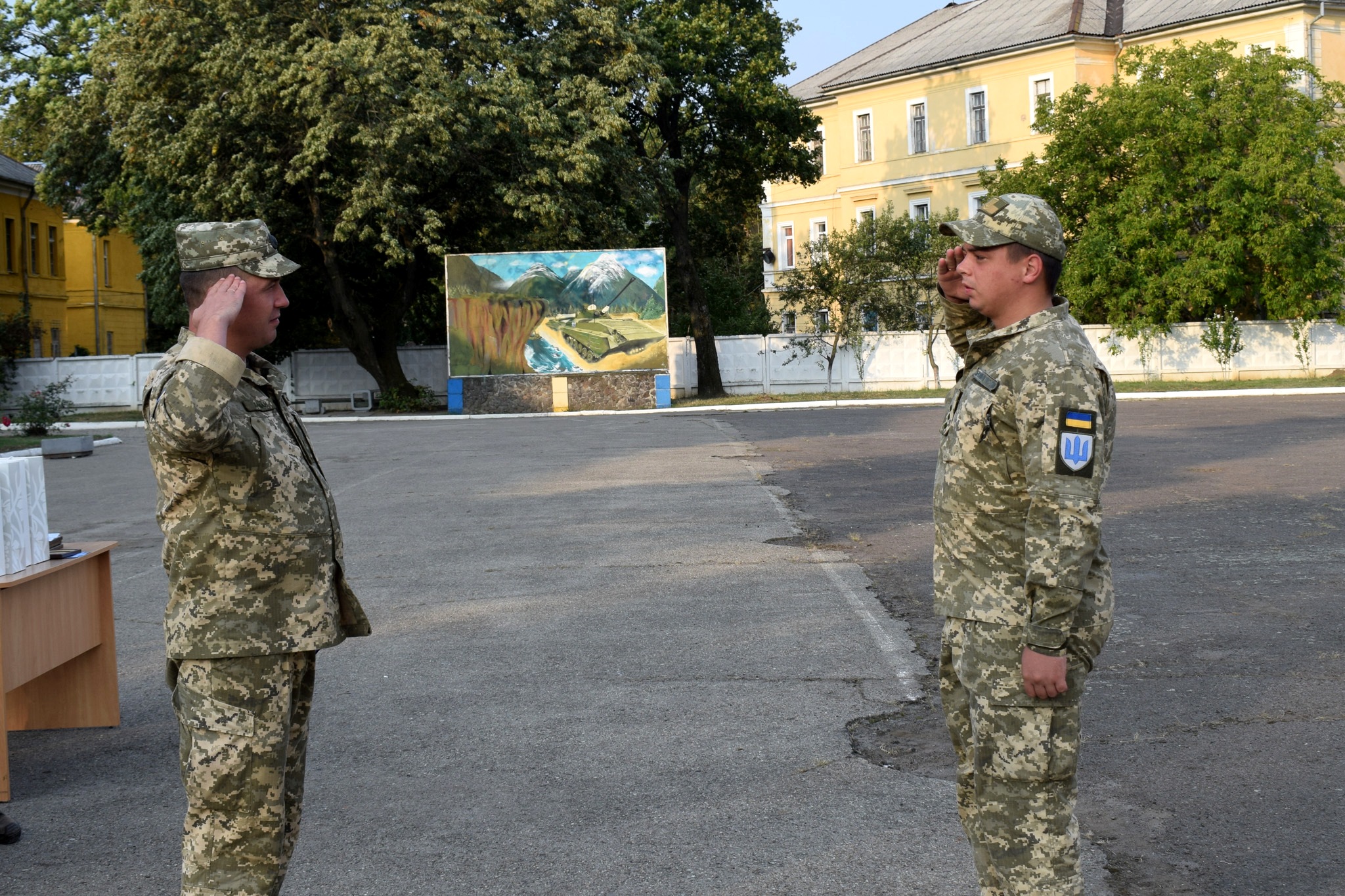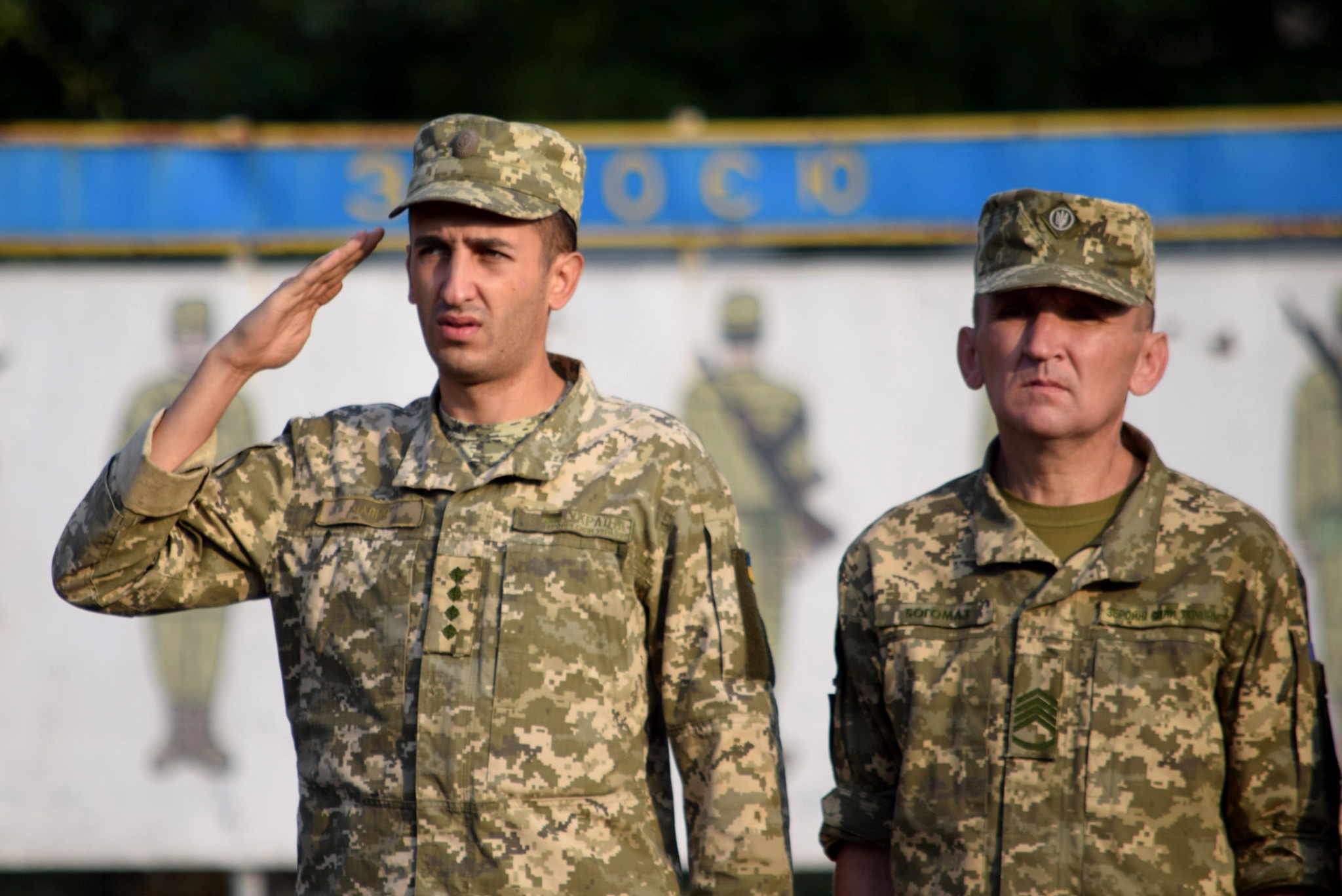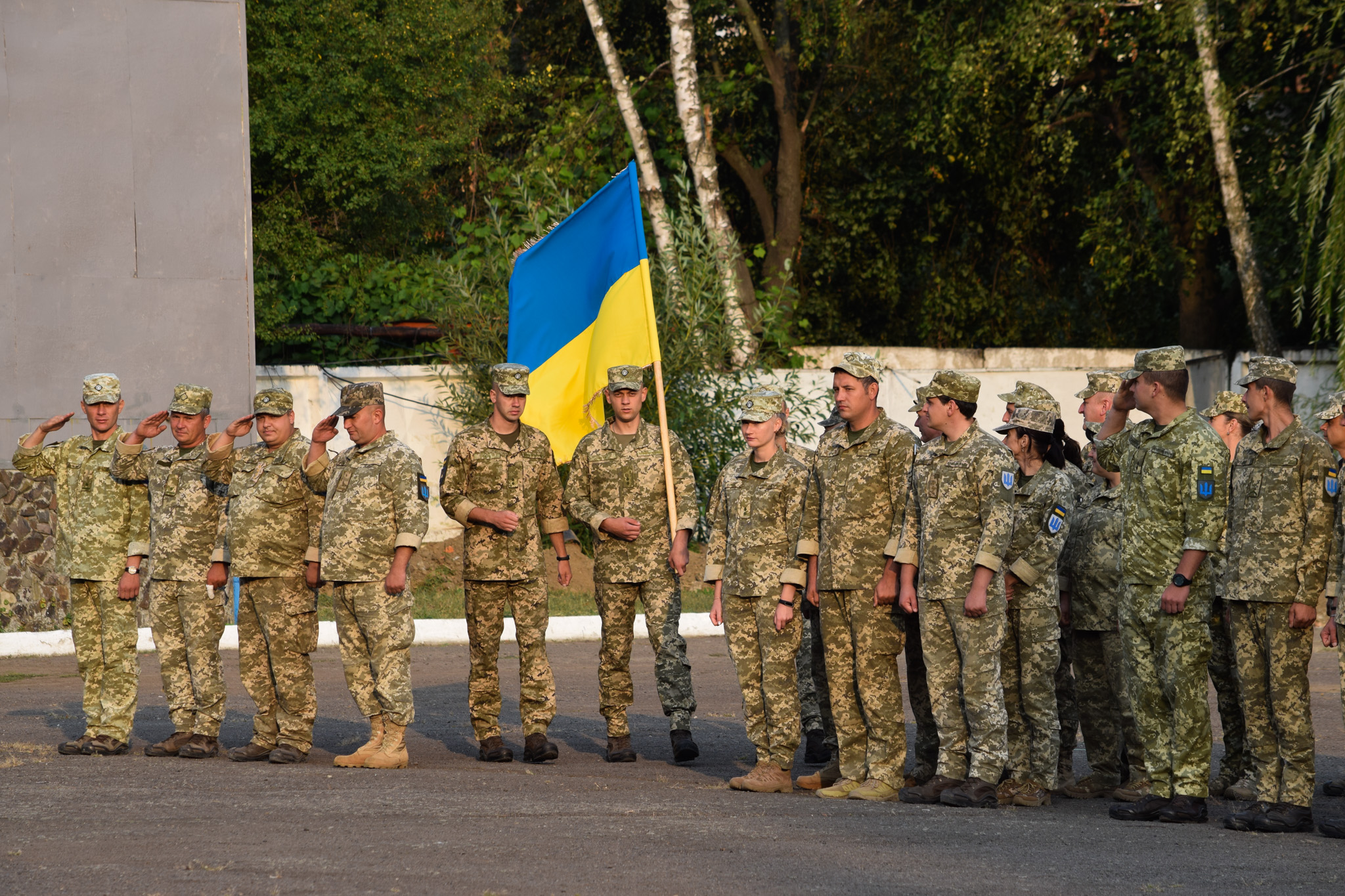 Під Гімн України підняли Державний Прапор, після чого хвилиною мовчання вшанували пам'ять свого побратима, старшого лейтенанта, командира гірсько-штурмової роти 15-го окремого гірсько-піхотного батальйону 128-ї окремої гірсько-штурмової бригади Георгія Ольховського, який загинув на Донеччині від кулі снайпера рівно рік тому - 23 серпня 2018 року, а також всіх загиблих на сході України.