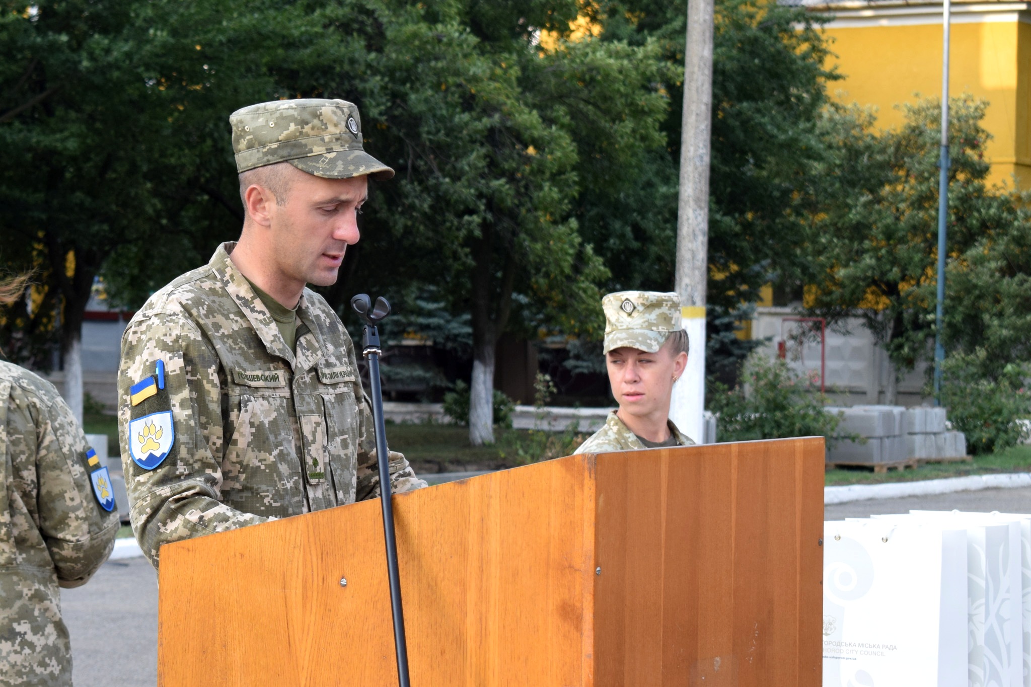 Відтак були вітальні слова від заступника командира 128-ї окремої гірсько-штурмової бригади, підполковника Віталія Дарабана, командира батальйону майора Івана Голішевського, заступника Закарпатського обласного комісара полковника Олександра Паламарчука, в.о. міського голови, заступника Ужгородського міського голови Ігоря Фартушка.