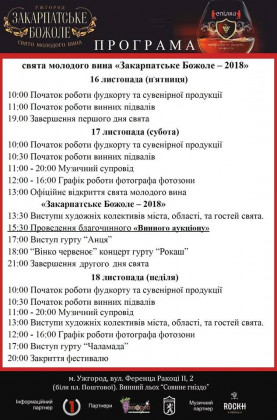 У п’ятницю, 16 листопада, у перший день свята, кращі винороби Закарпаття представлять свою продукцію у підвалах «Совиного гнізда», розпочне роботу і фуд-корт. Офіційне відкриття винного фестивалю – у суботу, 17 листопада, о 13.00. Із 12 години того ж дня працюватиме тематична фотозона. Проведуть у суботу і благодійний аукціон.