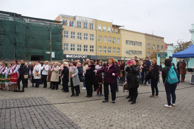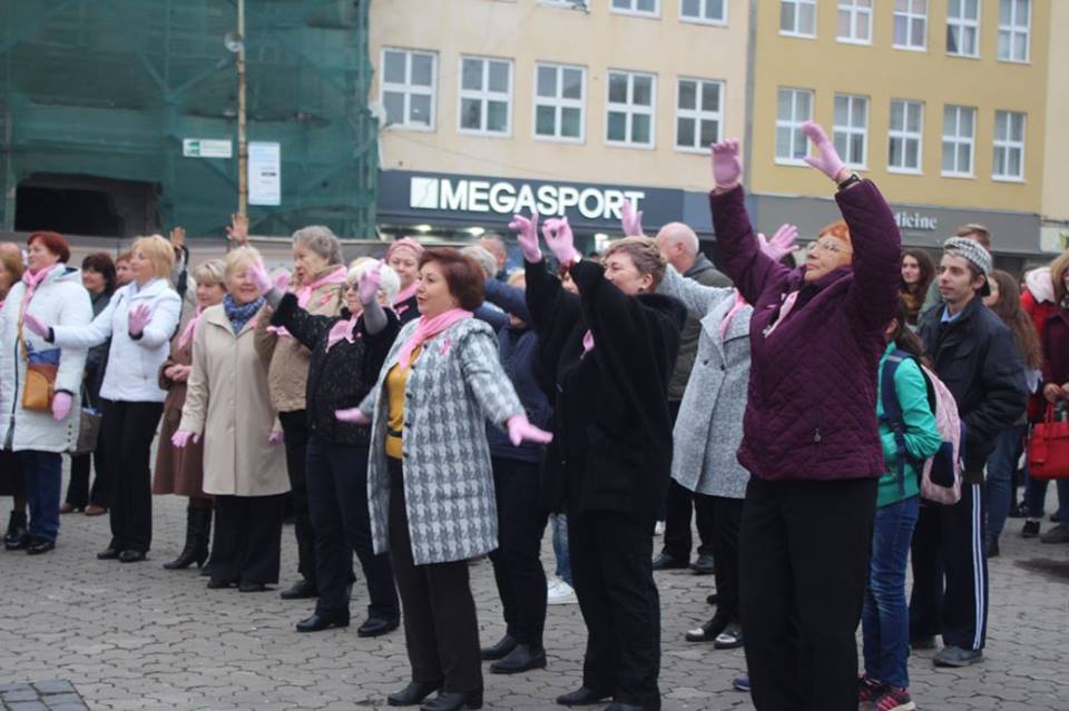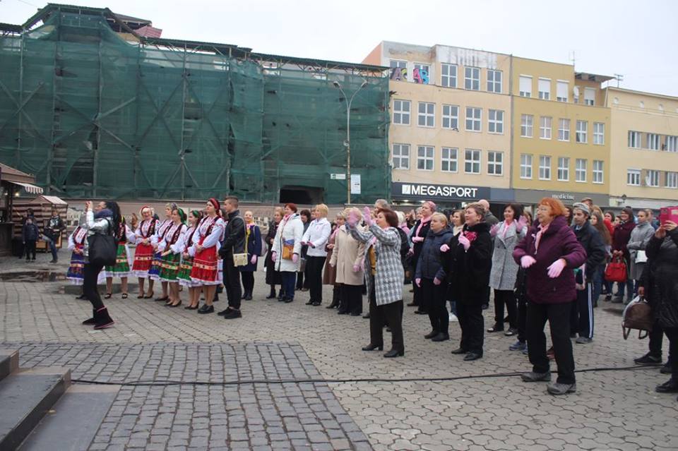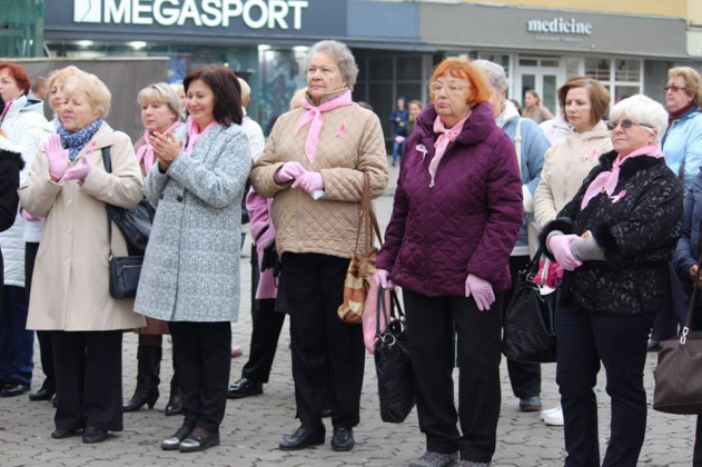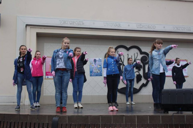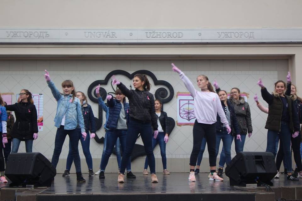 Учасники ужгородської Студії сучасного танцю «Бліц» підготували танцювальний флешмоб, до якого долучилися і присутні на площі. Усі мали змогу одягти рожеві рукавички й такого ж кольору стрічки. Саме цей колір став кольором міжнародного символу боротьби проти раку молочної залози.