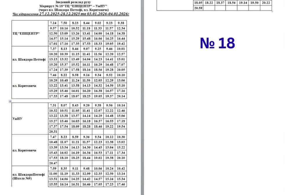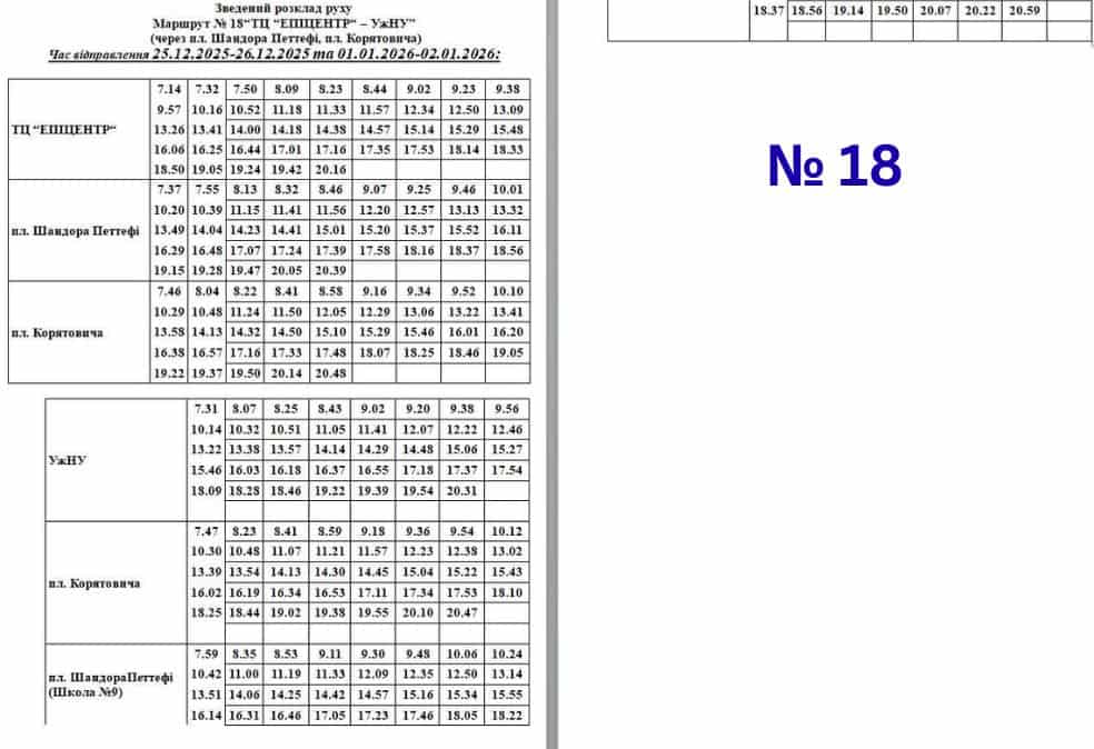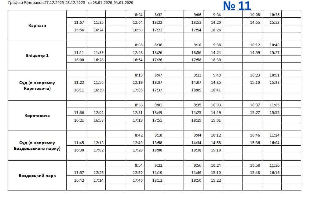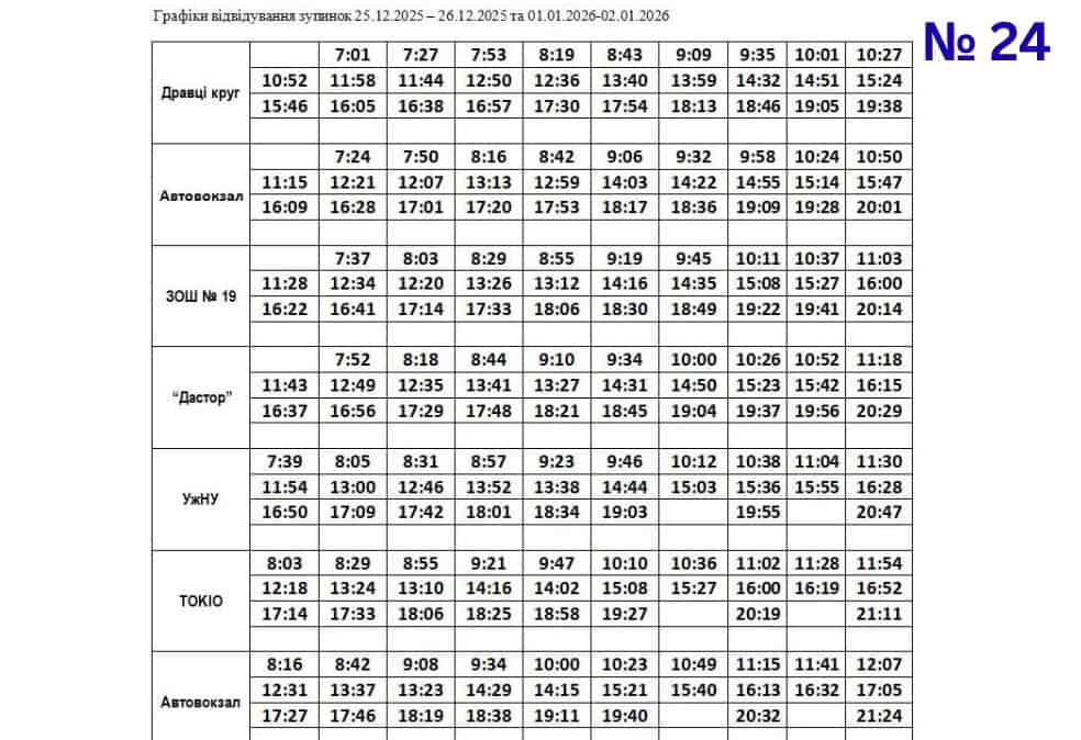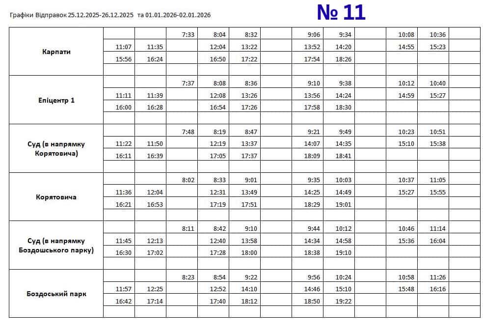 Комунальне Підприємство "Ужгородський муніципальний транспорт" надає актуальні графіки руху автобусів №№ 9, 11, 18, 20, 22, 24 та 156 у період різдвяно-новорічних свят.