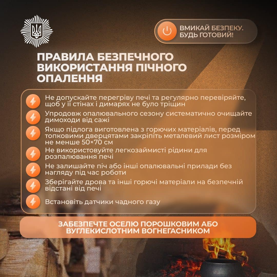 -Під час пічного опалення уникайте перегріву, регулярно чистьте димохід і ніколи не залишайте вогонь без нагляду.