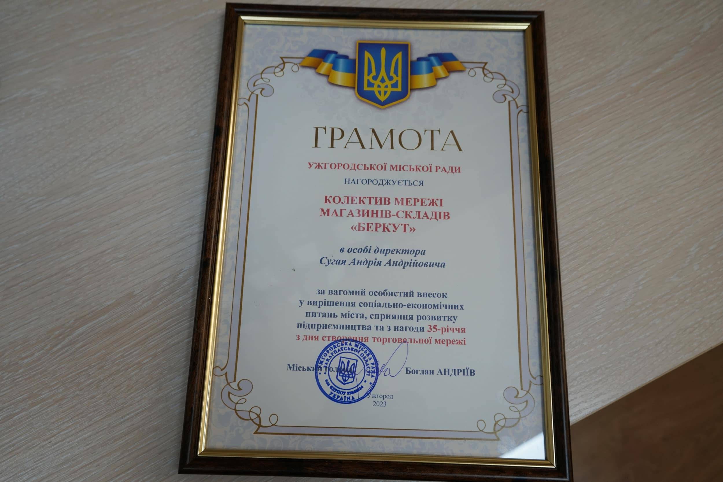 Грамоту Ужгородської міської ради за вагомий особистий внесок у вирішенні соціально-економічних питань міста, сприяння розвитку підприємництва керівнику товариства Андрію Сугаю вручив напередодні міський голова Богдан Андріїв.