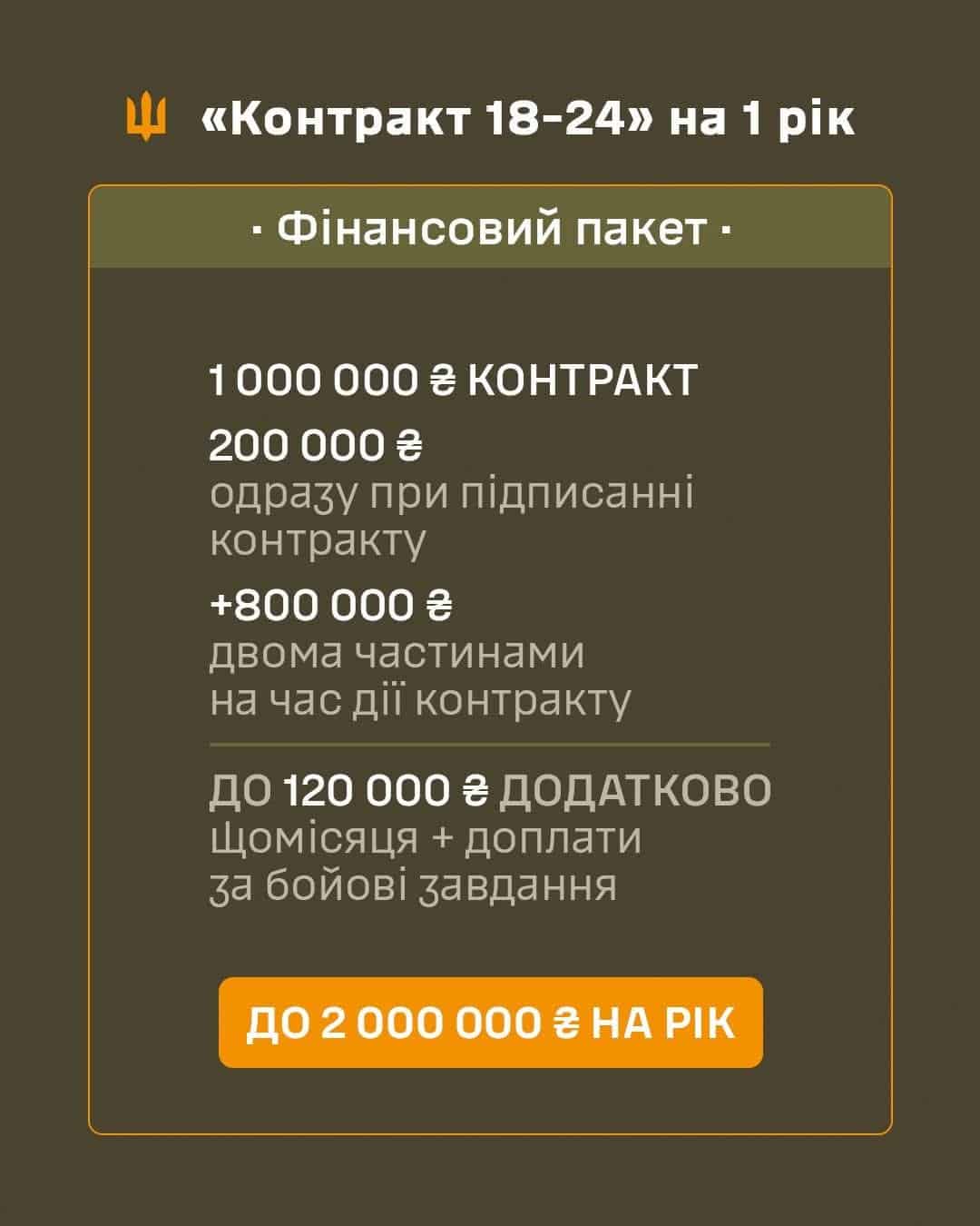 та 800 000 грн виплат двома частинами на час дії контракту) - ✔Додатково до 120 000 грн/місяць + доплати за бойові завдання