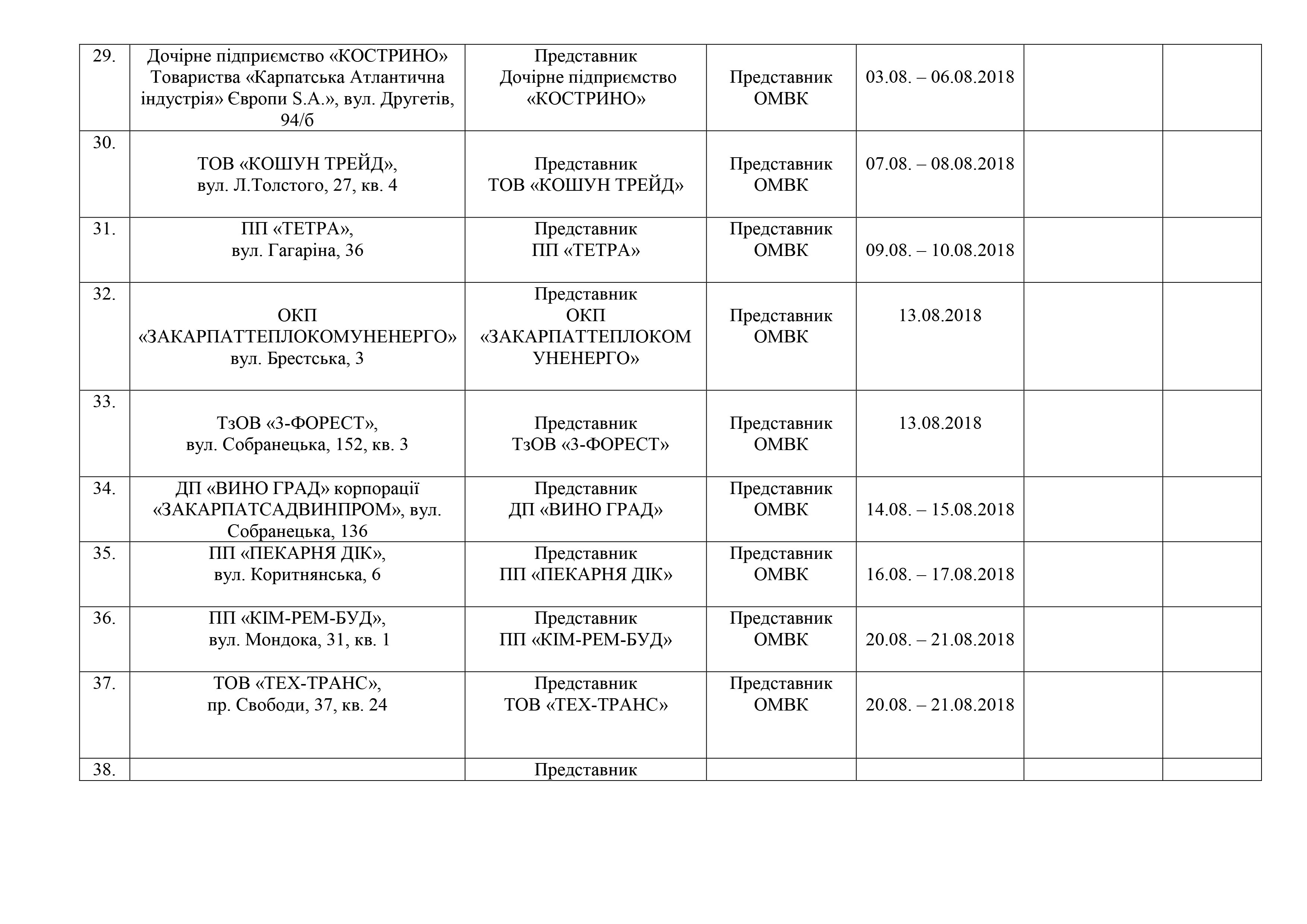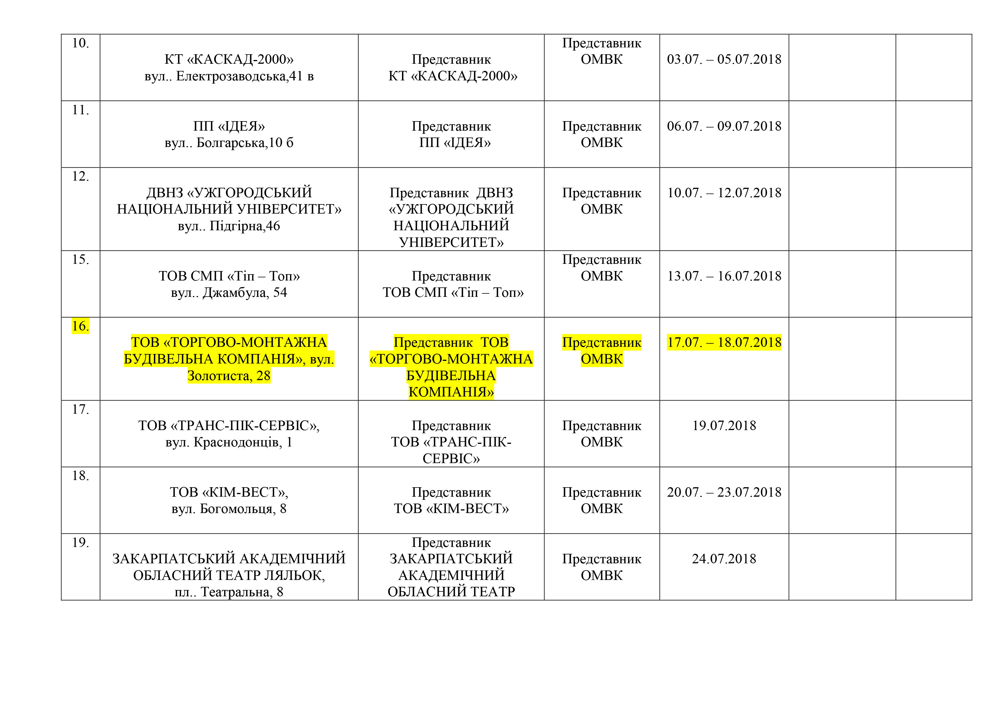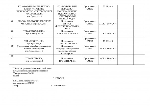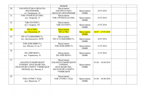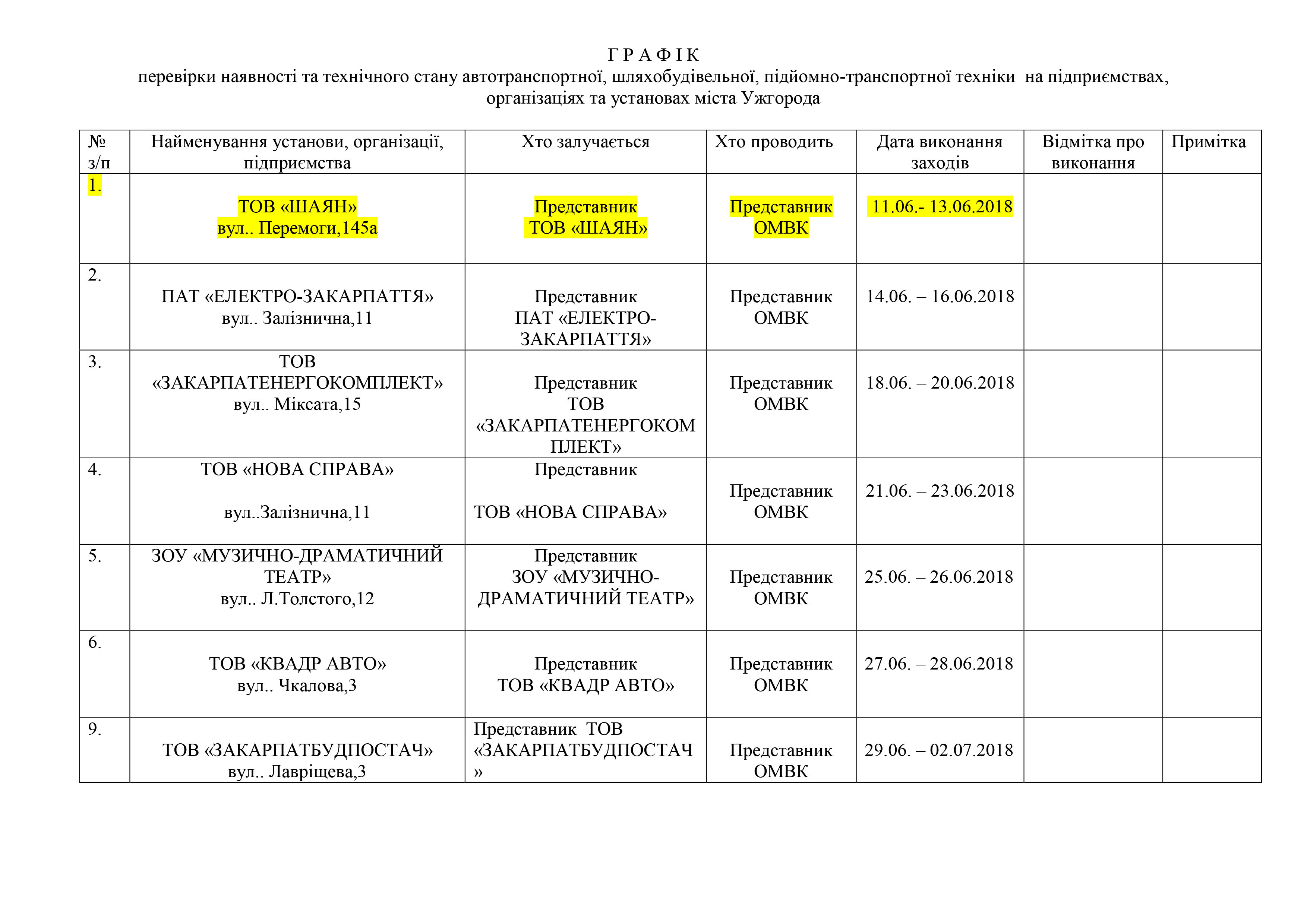 Графік перевірки наявності та технічного стану автотранспортної, шляхобудівельної, підйомно-транспортної техніки на підприємствах, організаціях та установах міста Ужгорода