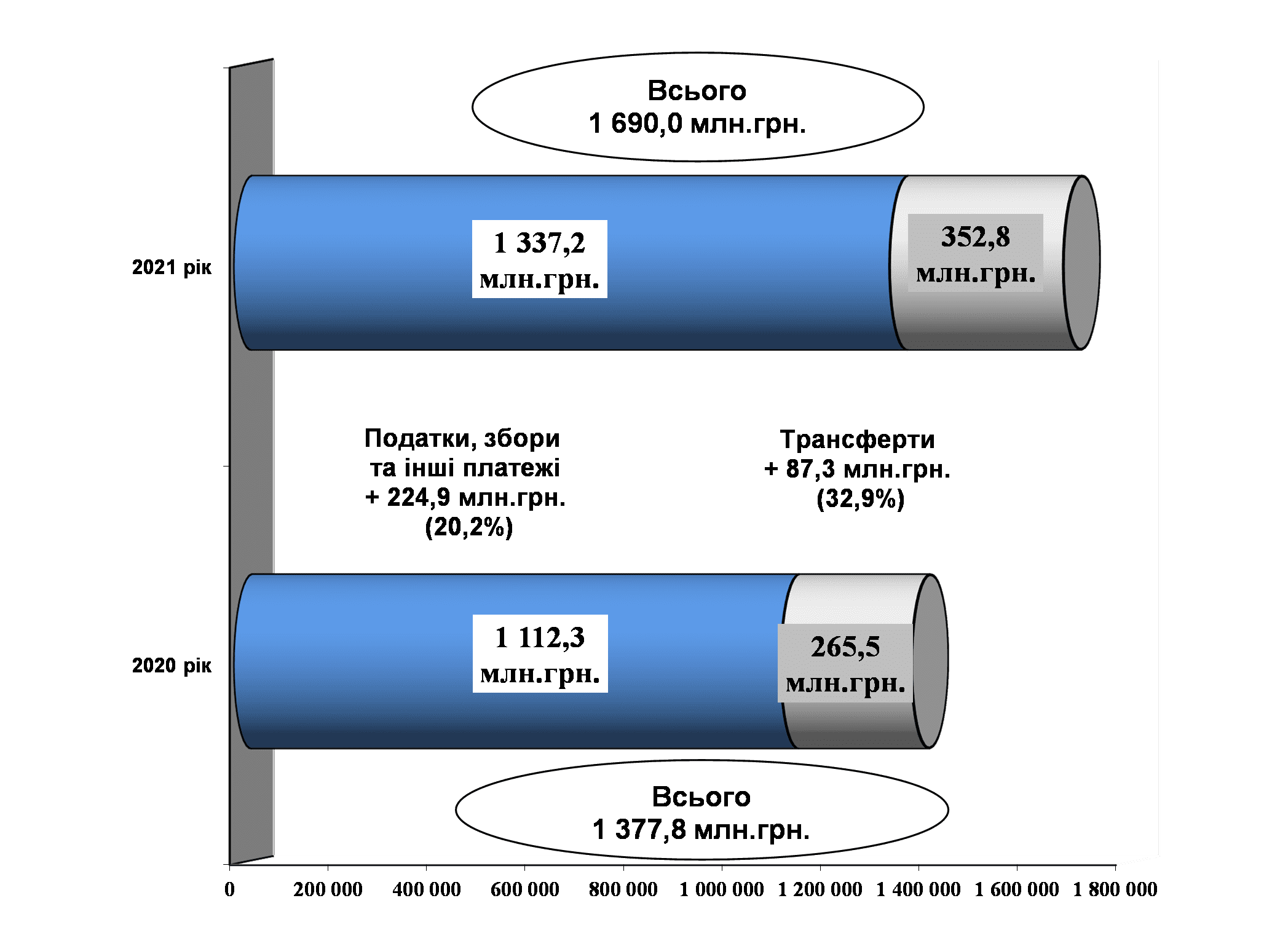 До бюджету громади у січні – грудні 2021 року зараховано 1 337,2 млн. грн. податків, зборів та інших обов’язкових платежів. У порівнянні з відповідним періодом 2020 року їх надходження зросли на 22,7% або на 312,3 млн грн.