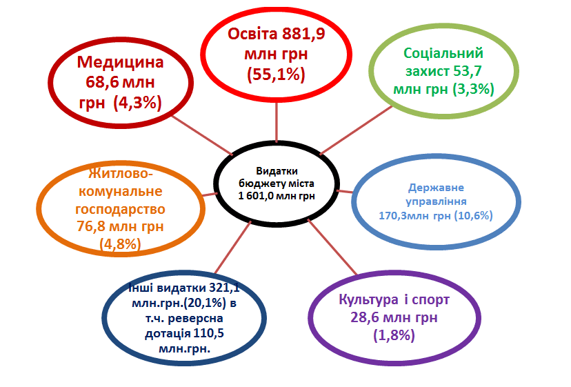 Видатки на утримання та здійснення повноважень бюджетних установ та утримання об’єктів благоустрою склали 1 304,8 млн. грн. (у тому числі за рахунок субвенції – 279,8 млн. грн.), видатки на розвиток – 296,2 млн. грн. (у тому числі за рахунок субвенції – 44,9 млн. грн.)