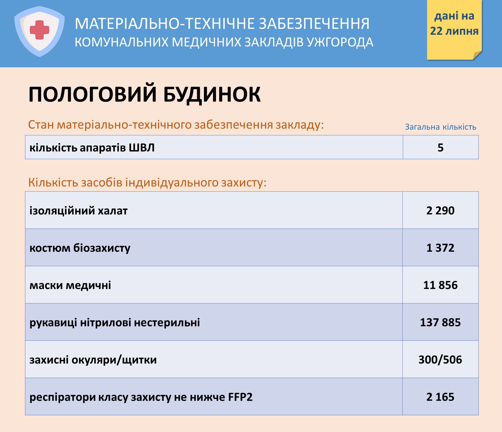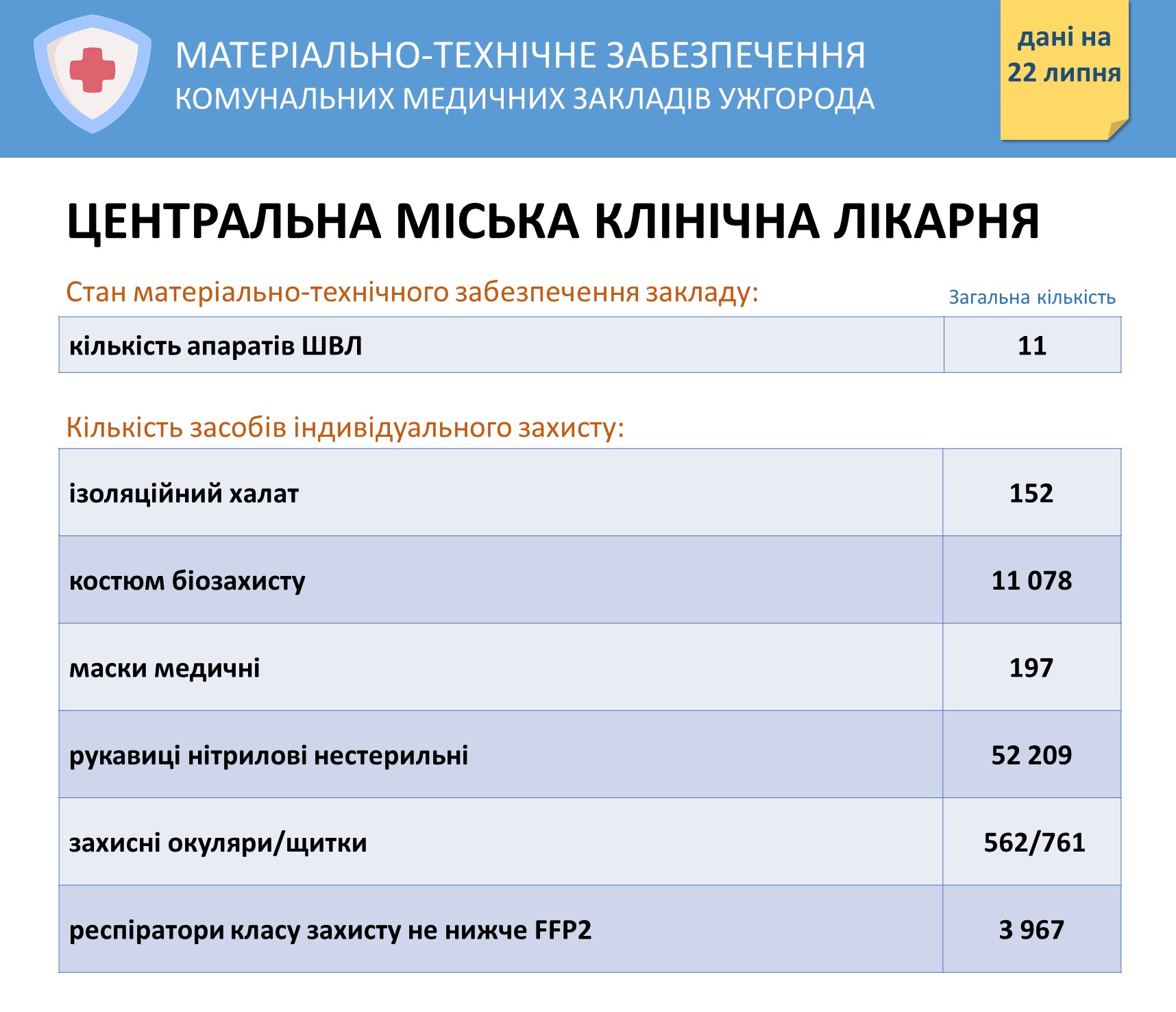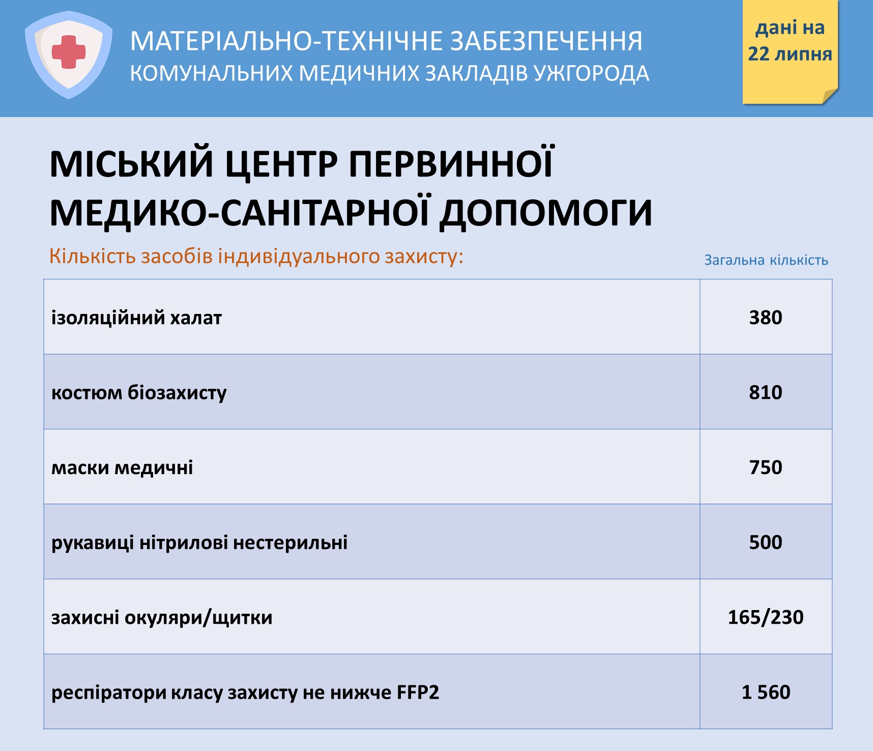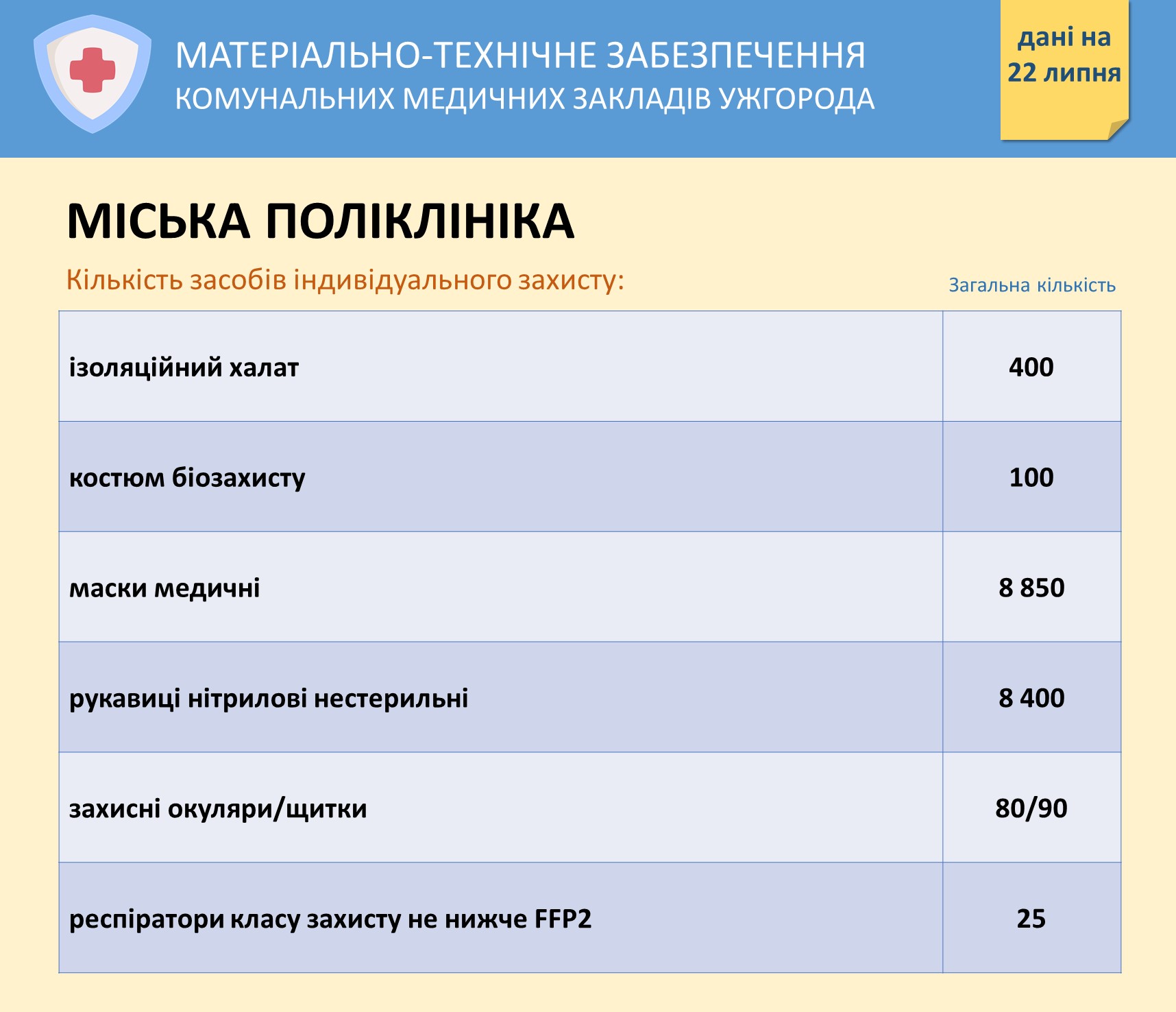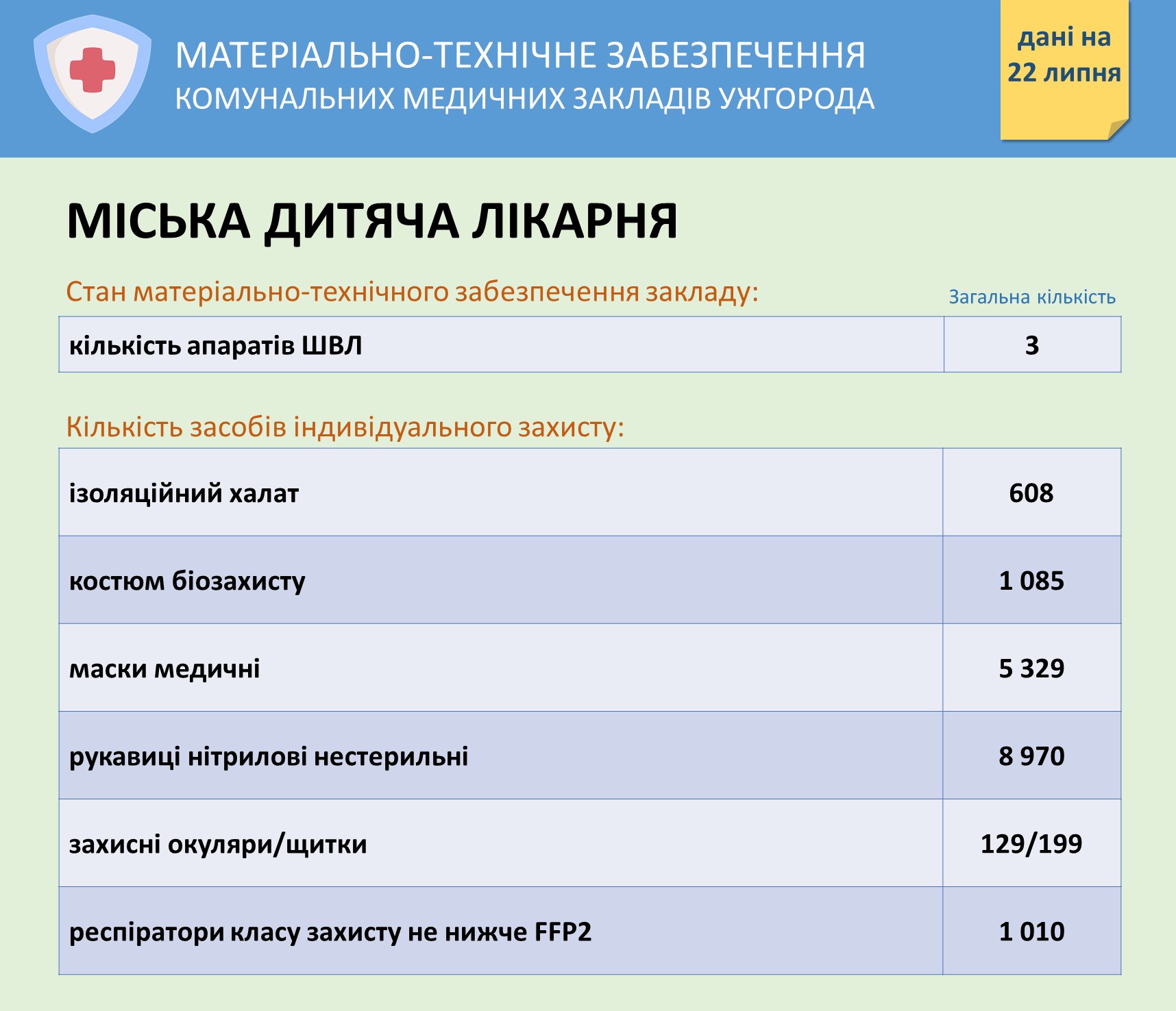 Інформація про забезпечення засобами захисту комунальних медзакладів Ужгорода на 22 липня Опубліковано: Липень 22, 2020