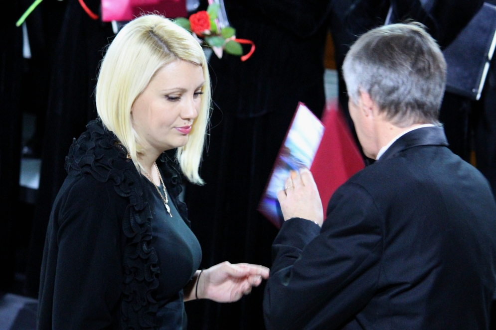 Також Андріана Сушко вручила учасникам колективу – Вікторії Дьордяй, Тарасу Петішко, Оресту Трачуку – грамоти Ужгородської міської ради за багаторічну творчу діяльність, активну участь у пропагуванні хорового мистецтва та з нагоди 25-річчя професійної діяльності, а також усьому колективу й керівнику – подарунок від міського голови.