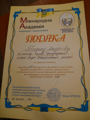 Сьогодні керівник Ужгородського відділення МАЛІЖ, заступник директора ЗОШ І–ІІІ ст. № 8 Ольга Урста вручила міському голові Ужгорода Богдану Андріїву подяку і передала щирі слова вітання за сприяння «Рекітському сузір’ю» від ректора Міжнародної Академії літератури і журналістики, заступника голови Правління МЦ ЮНЕСКО Василя Тарчинця.