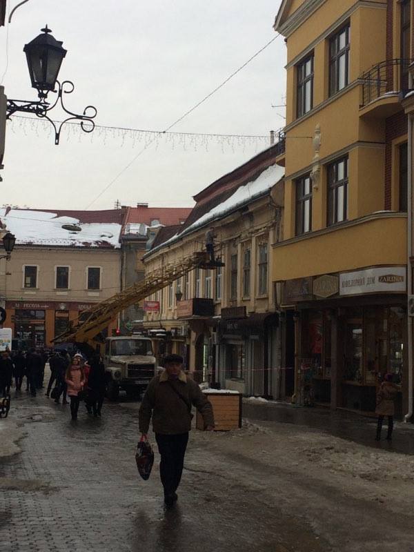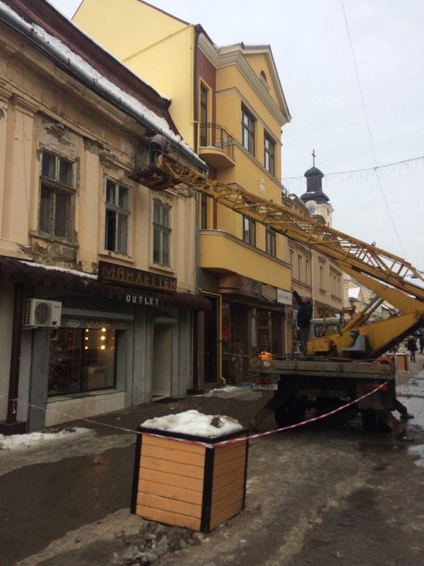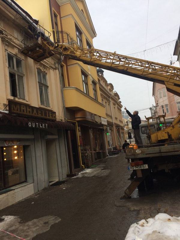 Працівники підприємства «Закарпателектробуд» із використанням автовишки ліквідовували сніг та бурульки також на інших будівлях центру міста.