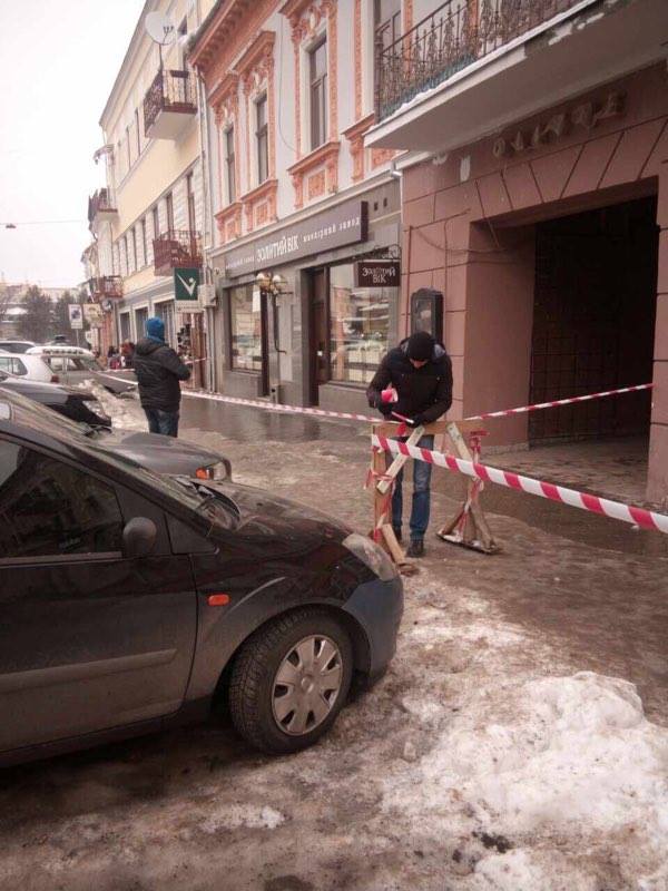 Брилу снігу та льоду, яка небезпечно нависла біля водостічної труби одного із будинків на площі Шандора Петефі в Ужгороді, сьогодні прибрали, задіявши автомашину з вишкою. Першочергово, поки чекали на прибуття спецтранспорту, працівники відділу муніципальної інспекції з благоустрою Ужгородської міської ради, щоб уберегти перехожих, встановили обмежувальну стрічку, де потенційно могла б впасти брила.