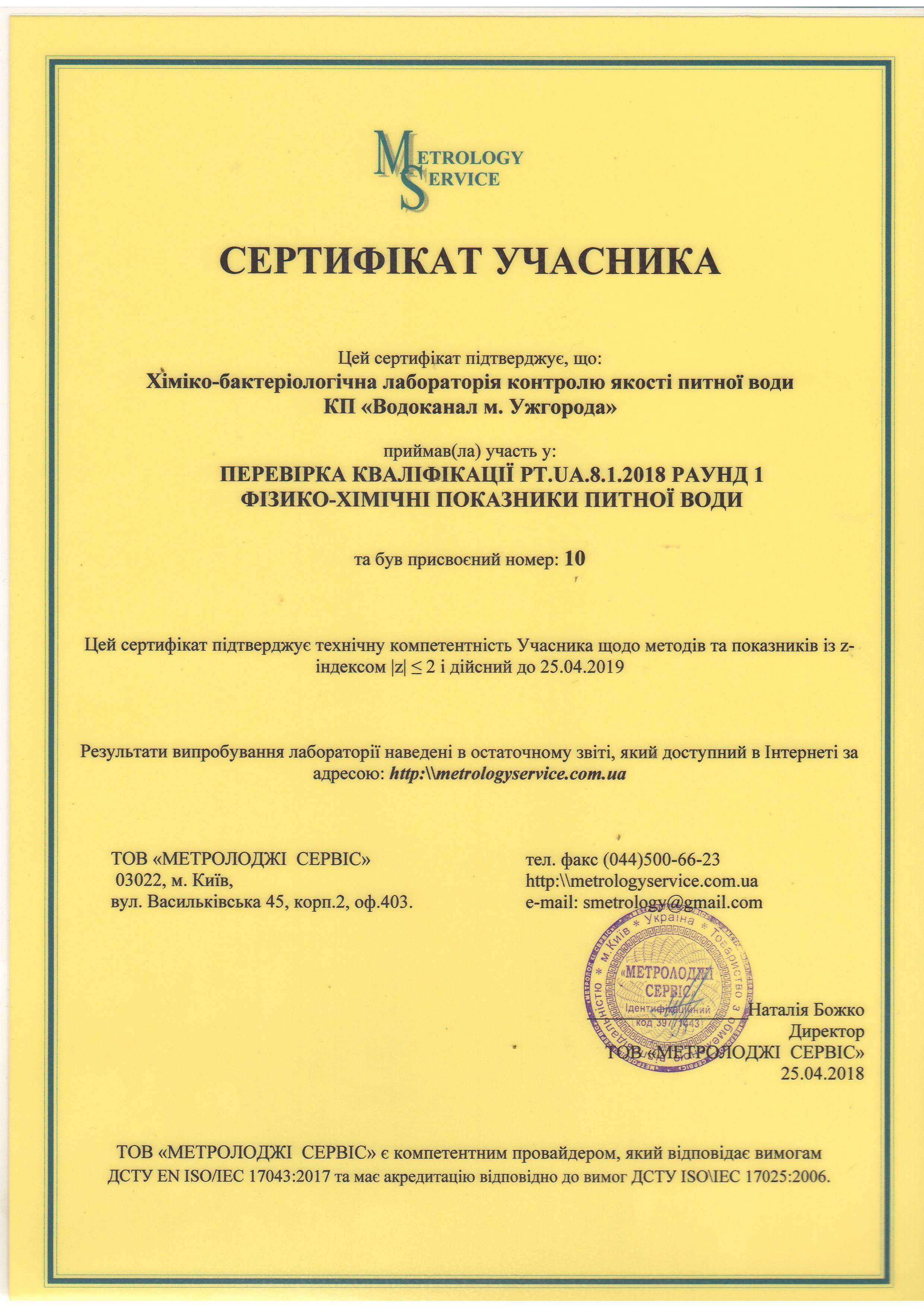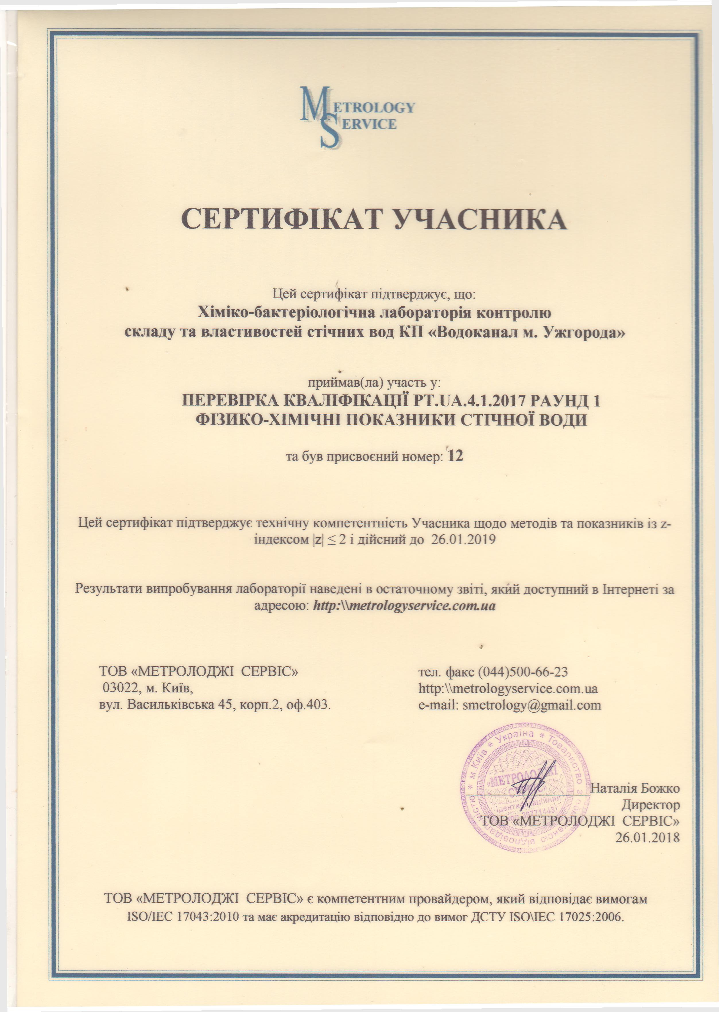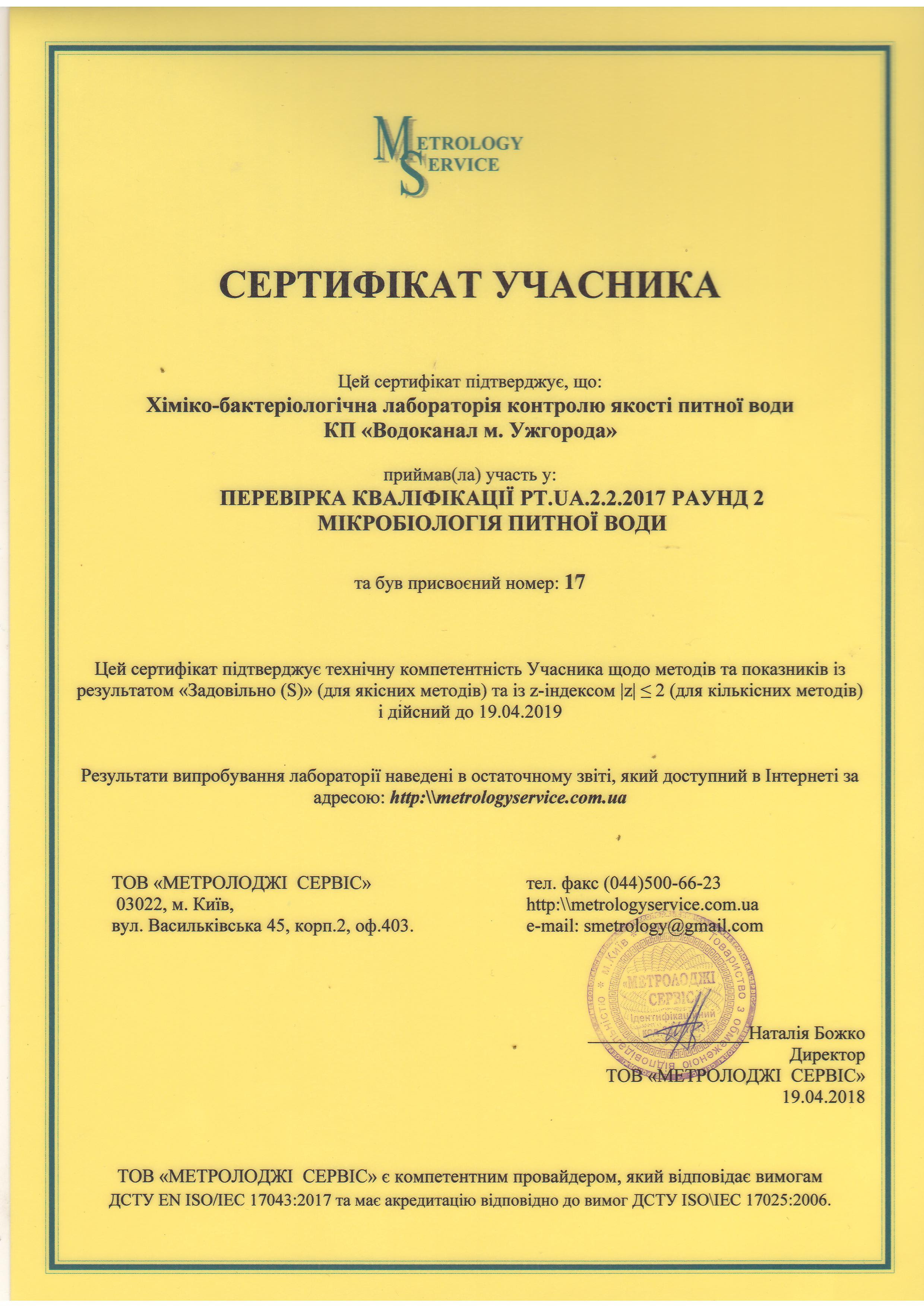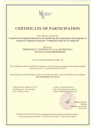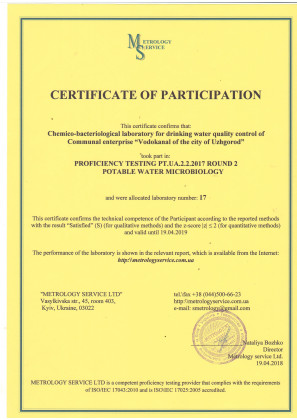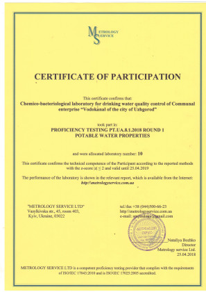 Лабораторії комунального підприємства «Водоканал м. Ужгорода» взяли участь у перевірці кваліфікації та отримали сертифікати, що підтверджують їхню технічну компетентність у визначенні мікробіологічних та фізико-хімічних показників питної та стічної води.