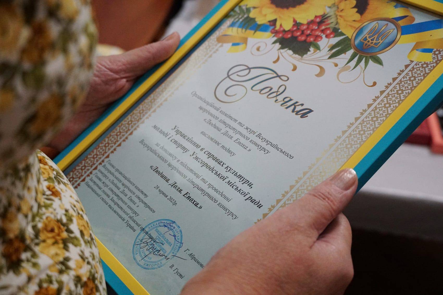 Також управлінню у справах культури, молоді та спорту Ужгородської міськради передали подяку оргкомітету та журі Всеукраїнського літературного конкурсу «Людина. Доля. Епоха» – за допомогу в організації та проведенні конкурсу в нашому місті.