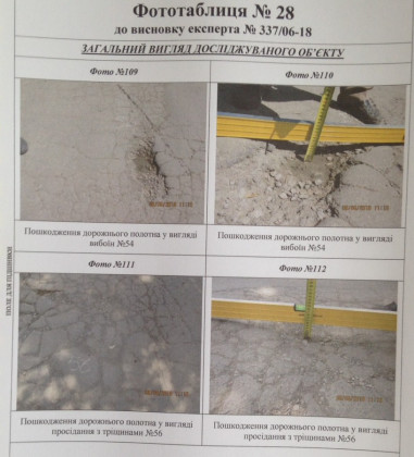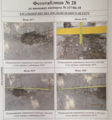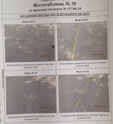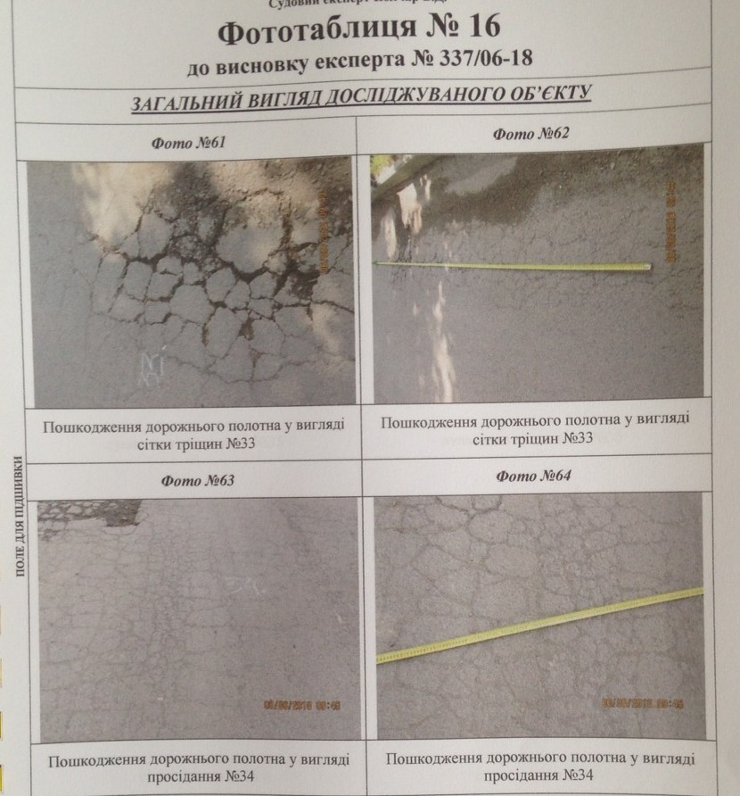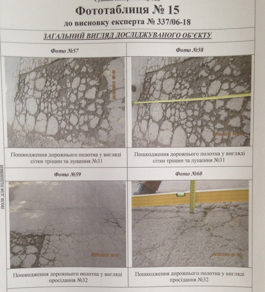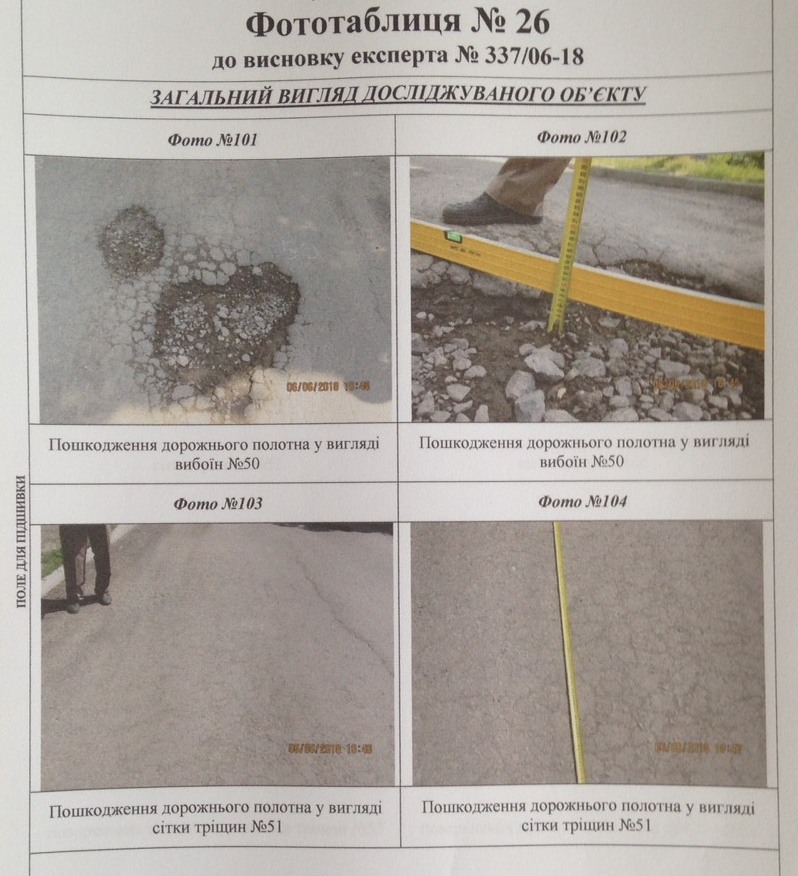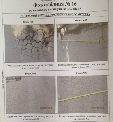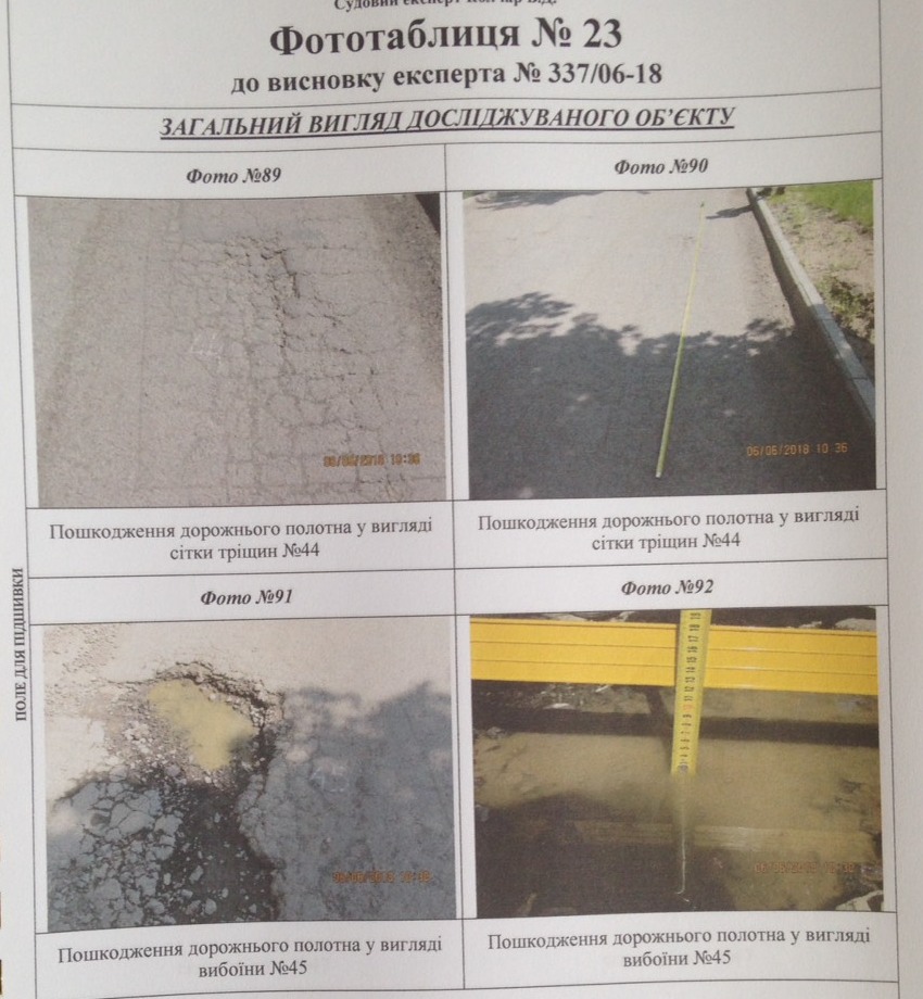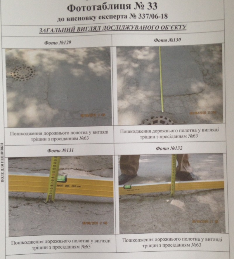 Судовий експерт досліджував нижній шар (основу під асфальтобетонне покриття), саме асфальтобетонне покриття, а також роботи з улаштування бетонних бортових каменів. Як було встановлено, роботи виконані частково, а саме на довжину близько 244 метри, при цьому фактично був улаштований тільки нижній шар асфальту. Було встановлено також, що існуюче покриття має численні деформації та руйнування, зокрема, осідання, тріщини у місцях осідання, сітки тріщин, лущення, вибоїни, поверхневі вибоїни.