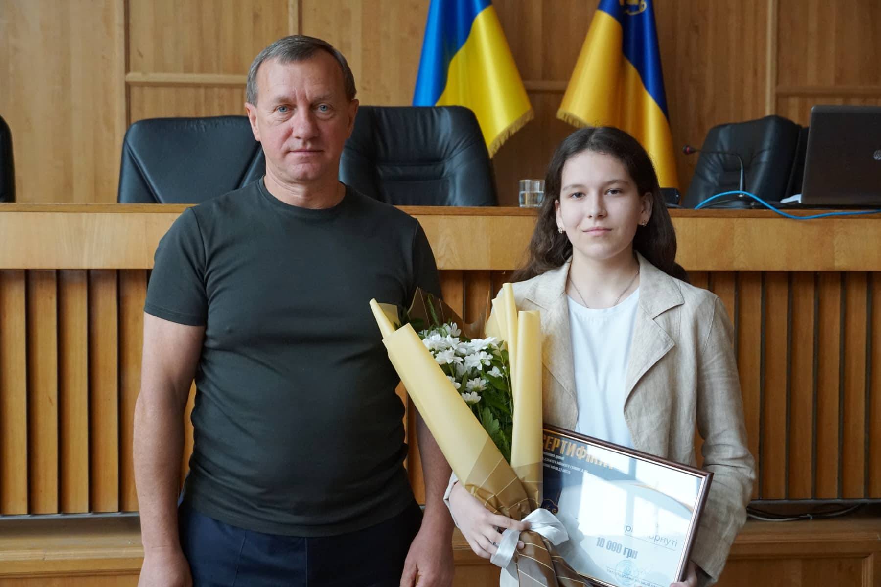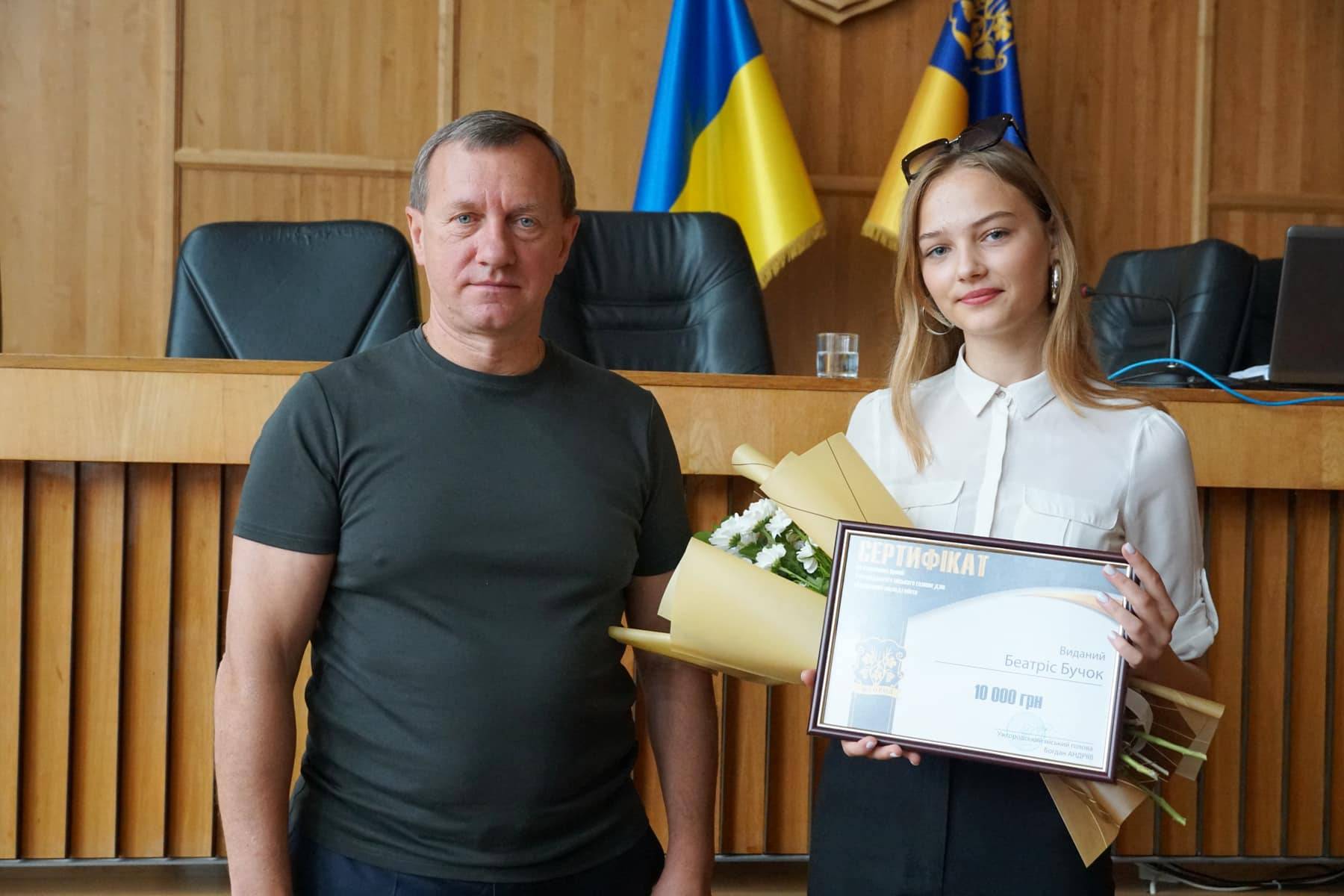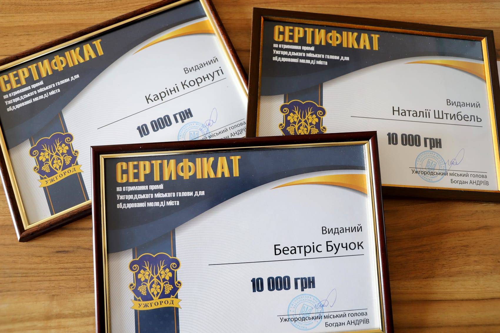 Сьогодні на початку роботи сесії Ужгородської міськради міський голова Богдан Андріїв нагородив юних талановитих ужгородок. Премію Ужгородського міського голови для обдарованої молоді, яка вручається вже четвертий рік поспіль, та грошову винагороду по 10 тисяч гривень отримали: Наталія Штибель – студентка ІІ курсу факультету образотворчого мистецтва, Закарпатської академії мистецтв; Біатріс Бучок – студентка ІІІ курсу спеціалізації «фортепіано» Ужгородського музичного фахового коледжу імені Дезидерія Задора; Каріна Корнута – учениця 7 класу Ужгородської музичної школи № 1 імені Петра Чайковського.