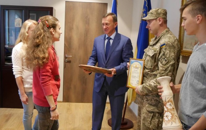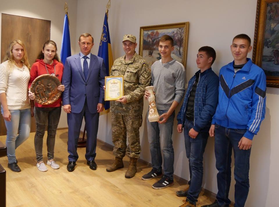 Ужгородського міського голову Богдана Андріїва з Днем міста вітали сьогодні військовий комісар Ужгородського ОМВК підполковник Микола Журавльов та учні місцевого ПТУ №5. Діти подарували власноруч виготовлені вироби, а від об’єднаного міського військового комісаріату та Ужгородської філії громадської організації інвалідів АТО Микола Журавльов вручив керівнику міста грамоту – за сприяння в розвитку Збройних Сил України та дієву підтримку територіального загону оборони Ужгородського ОМВК.