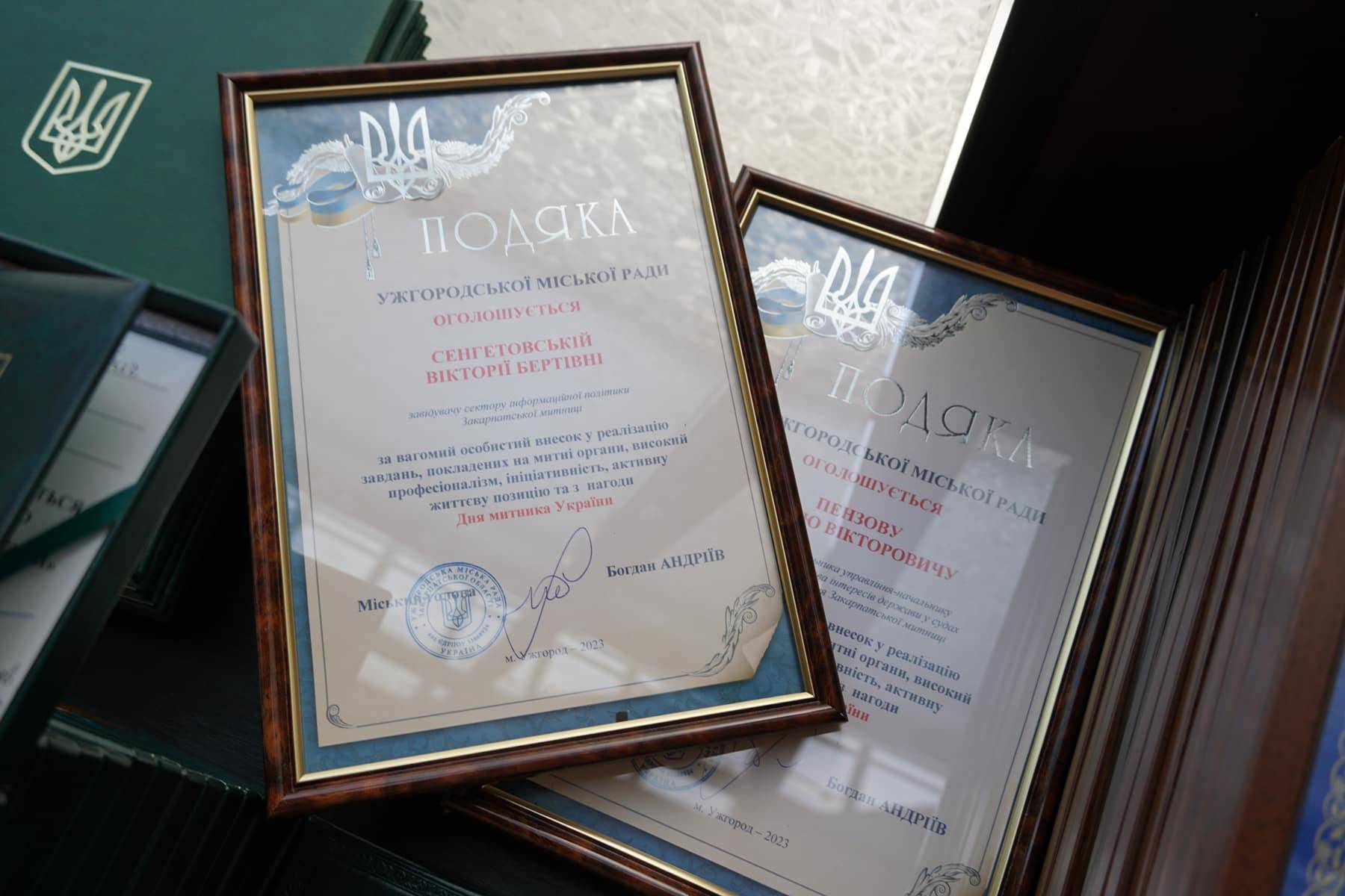 За високий професіоналізм, сумлінну працю та ініціативність подяками Ужгородської міської ради відзначили працівників Закарпатської митниці – начальницю організаційно-розпорядчого управління Марію Молнар, заступника начальника управління-начальнику відділу представництва інтересів держави у судах юридичного управління Сергія Пензова, завідувачку сектору інформаційної політики Закарпатської митниці Вікторію Сенгетовську, головну державну інспекторку відділу митного оформлення № 1 митного поста «Ужгород – вантажний» Христині Федчик.
