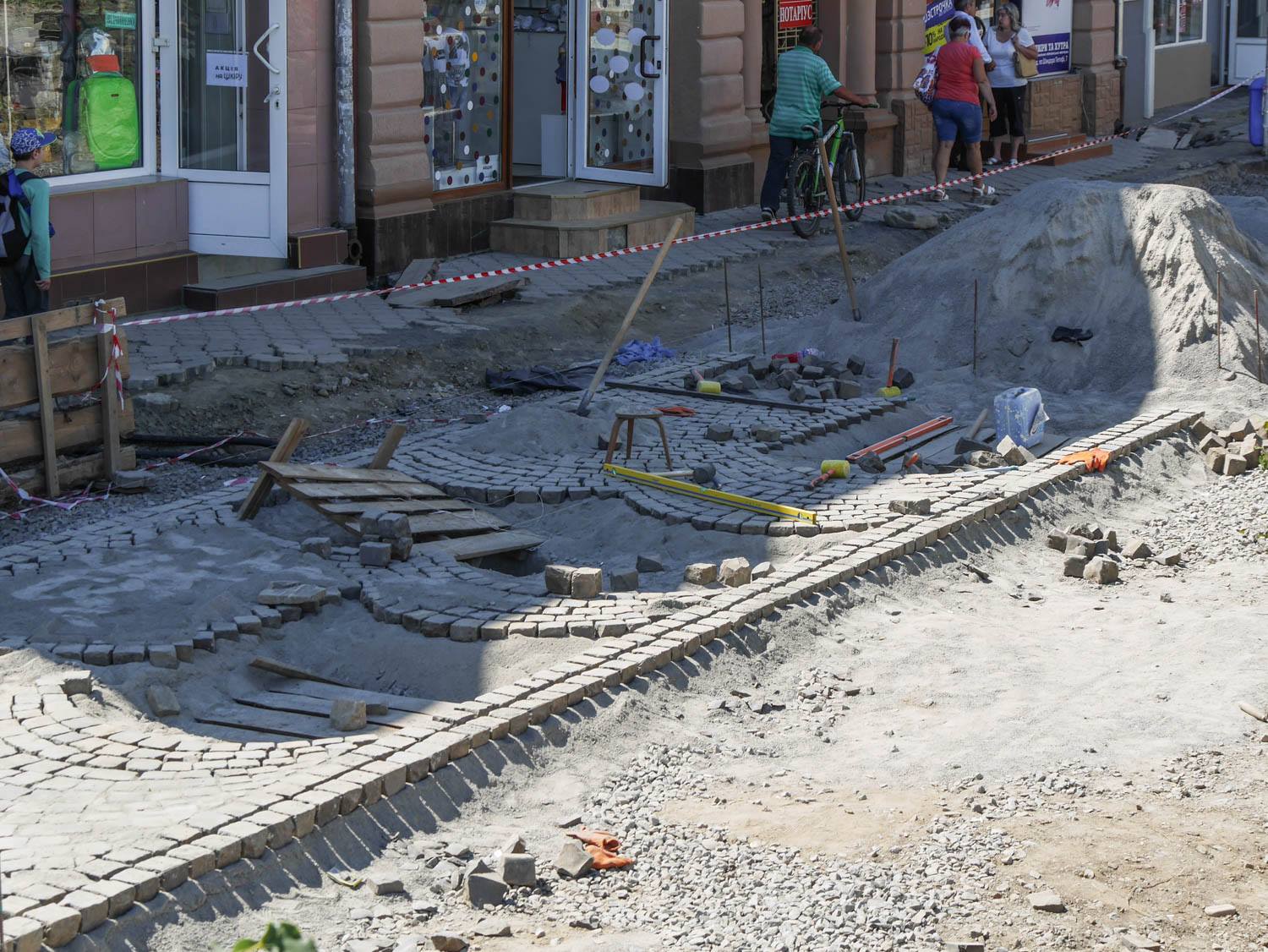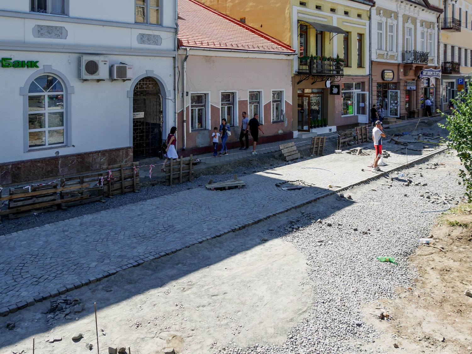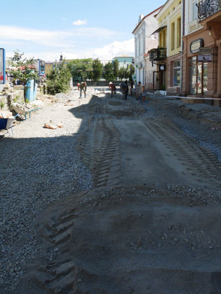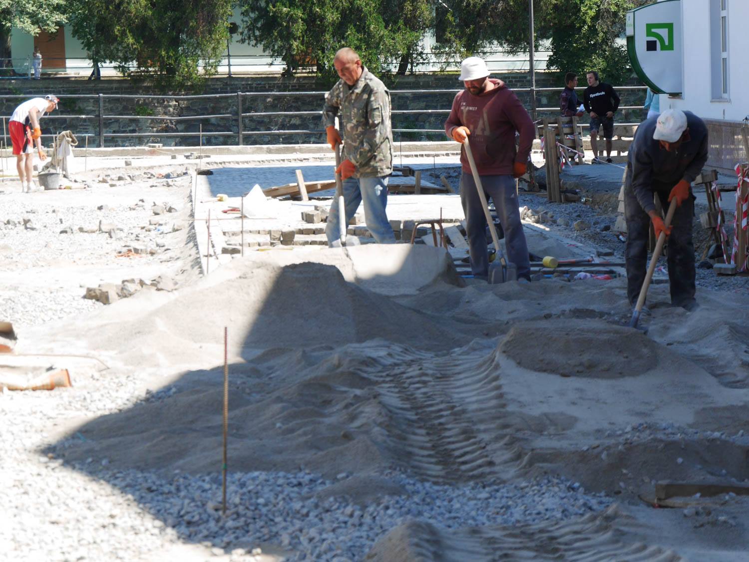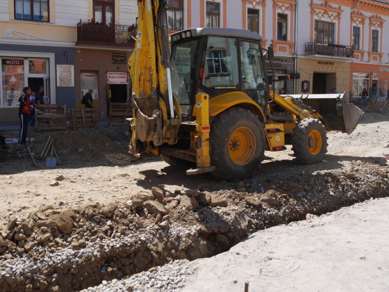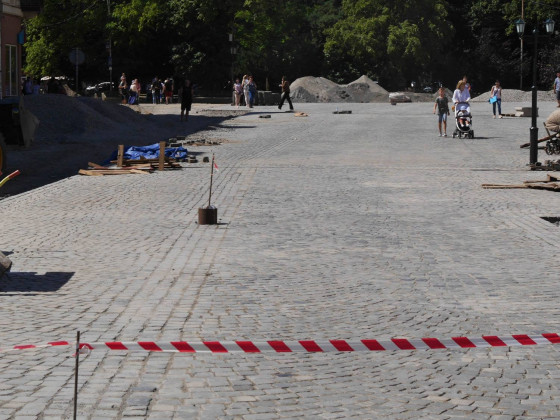 Як відомо, на площі провели заміну комунікацій, уже викладено кам’яною бруківкою, яку раніше забрали з кількох вулиць міста, значну частину пішохідної зони. Із правого боку, біля пішохідного мосту, видно чіткі обриси майбутньої велодоріжки. Роблять також лунки для дерев, які висадять на площі, місця для підключення ліхтарів, незабаром почнуть викладати тротуари.