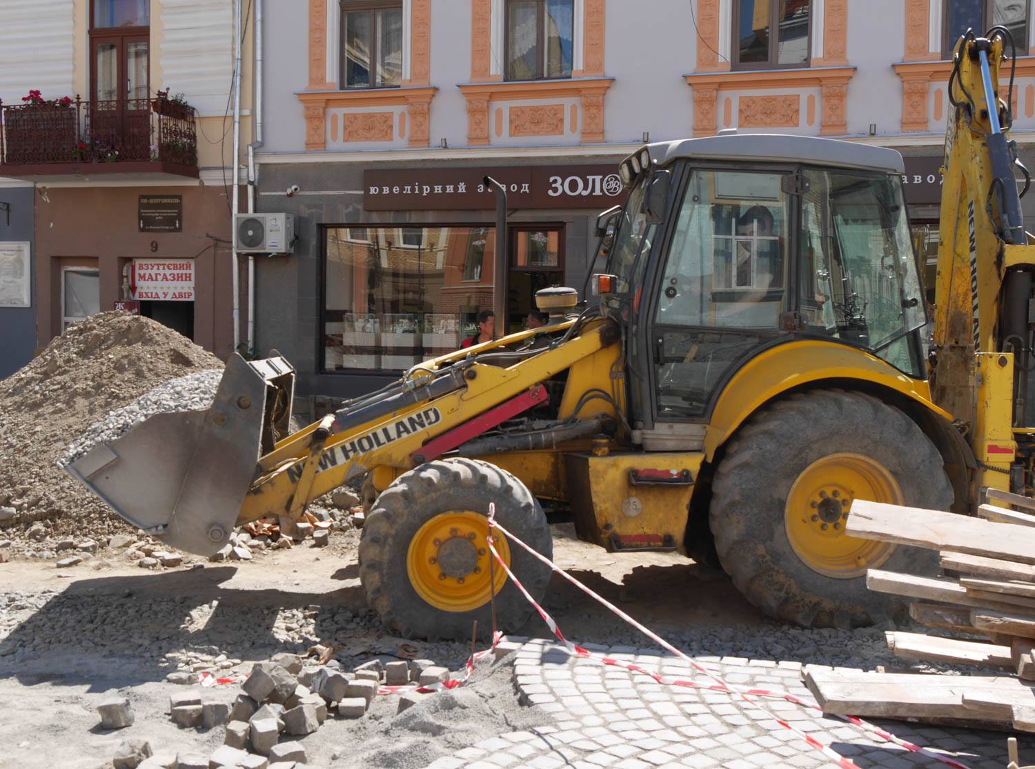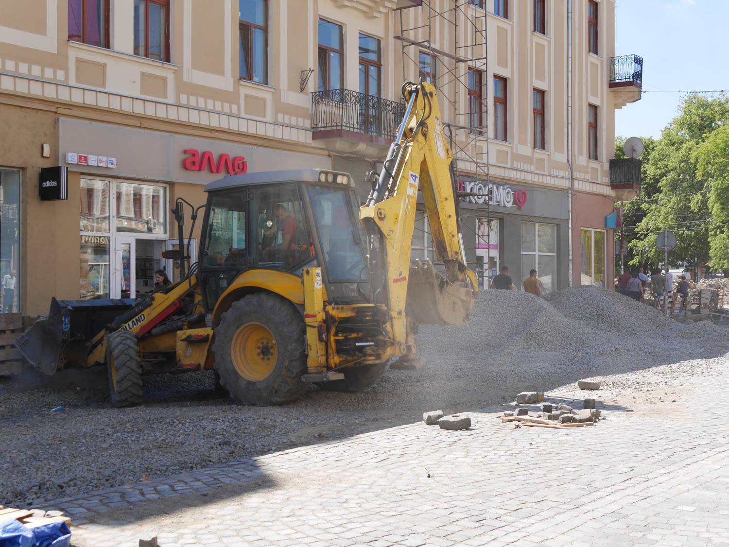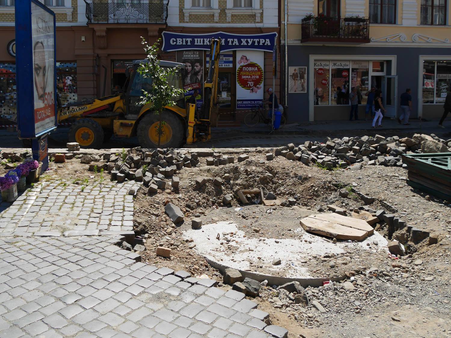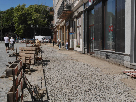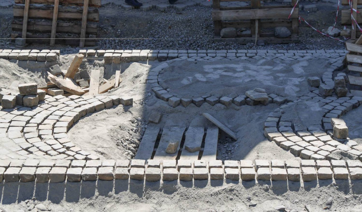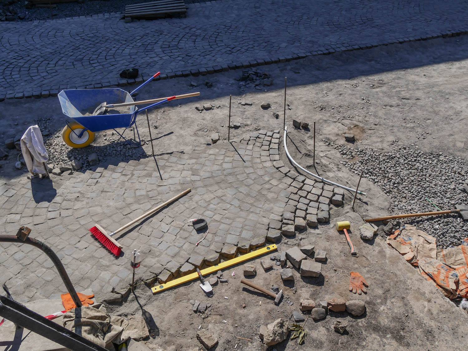 Як відомо, на площі провели заміну комунікацій, уже викладено кам’яною бруківкою, яку раніше забрали з кількох вулиць міста, значну частину пішохідної зони. Із правого боку, біля пішохідного мосту, видно чіткі обриси майбутньої велодоріжки. Роблять також лунки для дерев, які висадять на площі, місця для підключення ліхтарів, незабаром почнуть викладати тротуари.