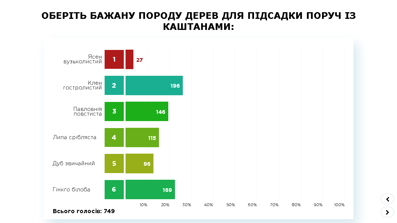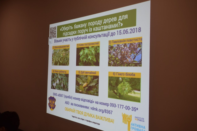 «Що важливо – процедура консультацій запускається на ранніх етапах, коли ще не прийнято рішення влади, а міська влада хоче почути, чого хоче громада. Ми мали шалену дискусію у мережі Фейсбук, і це теж гарний показник зацікавленості у діалозі. У підсумку, до онлайн- та sms-голосування, яке фінішувало 15 червня, долучилися 749 громадян, чиї голоси і визначили фаворитів серед шести запропонованих для підсаджування порід дерев. 39 відповідей надійшли через sms, 710 – онлайн Відтак, ясен вузьколистий отримав 27 голосів, клен гостролистий – 196 голосів, павловнія повстиста – 146 голосів, липа срібляста – 115 голосів, дуб звичайний – 95 голосів та гінкго білоба – 169 голосів», – зазначив Микола Яцков.