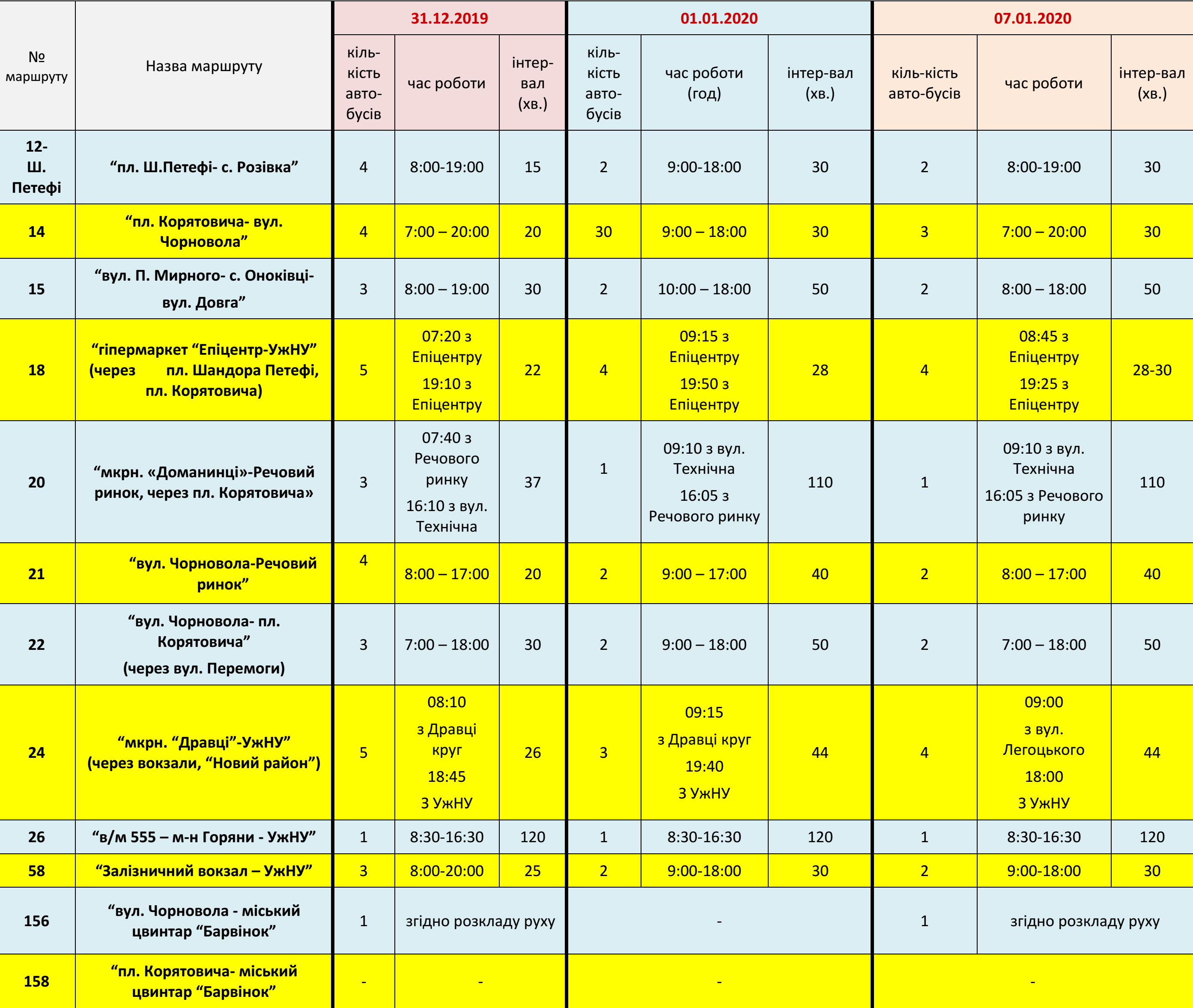 До уваги пасажирів! Розклад руху автобусів на міських маршрутах в Ужгороді на новорічно-різдвяні свята буде змінено.