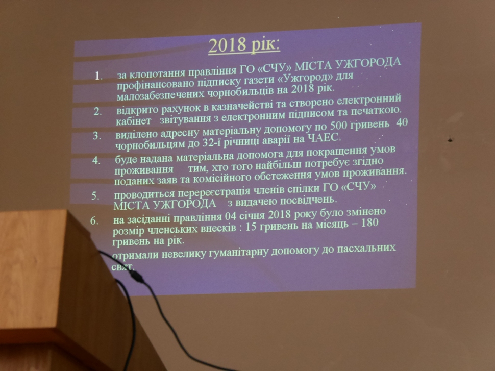 Голова Ужгородської міської організації «Союз Чорнобиль України» Олександр Чемет навів сумну статистику, згідно з якою на обліку перебуває 496 чорнобильців, із яких 281 ліквідатор, 27 евакуйованих, 183 переселенців. Приблизно за останні 10 років померло 149 чорнобильців, тільки минулого року – 8, а станом на квітень цього року – ще 2. Він наголосив, що за допомогою міської влади, профспілок необхідно розвивати та впроваджувати ініціативу про присвоєння учасникам Чорнобильської катастрофи 3-ї групи інвалідності. Також Олександр Чемет коротко розповів про зроблене міською організацією у 2017 році та вже цього року, плани на майбутнє.
