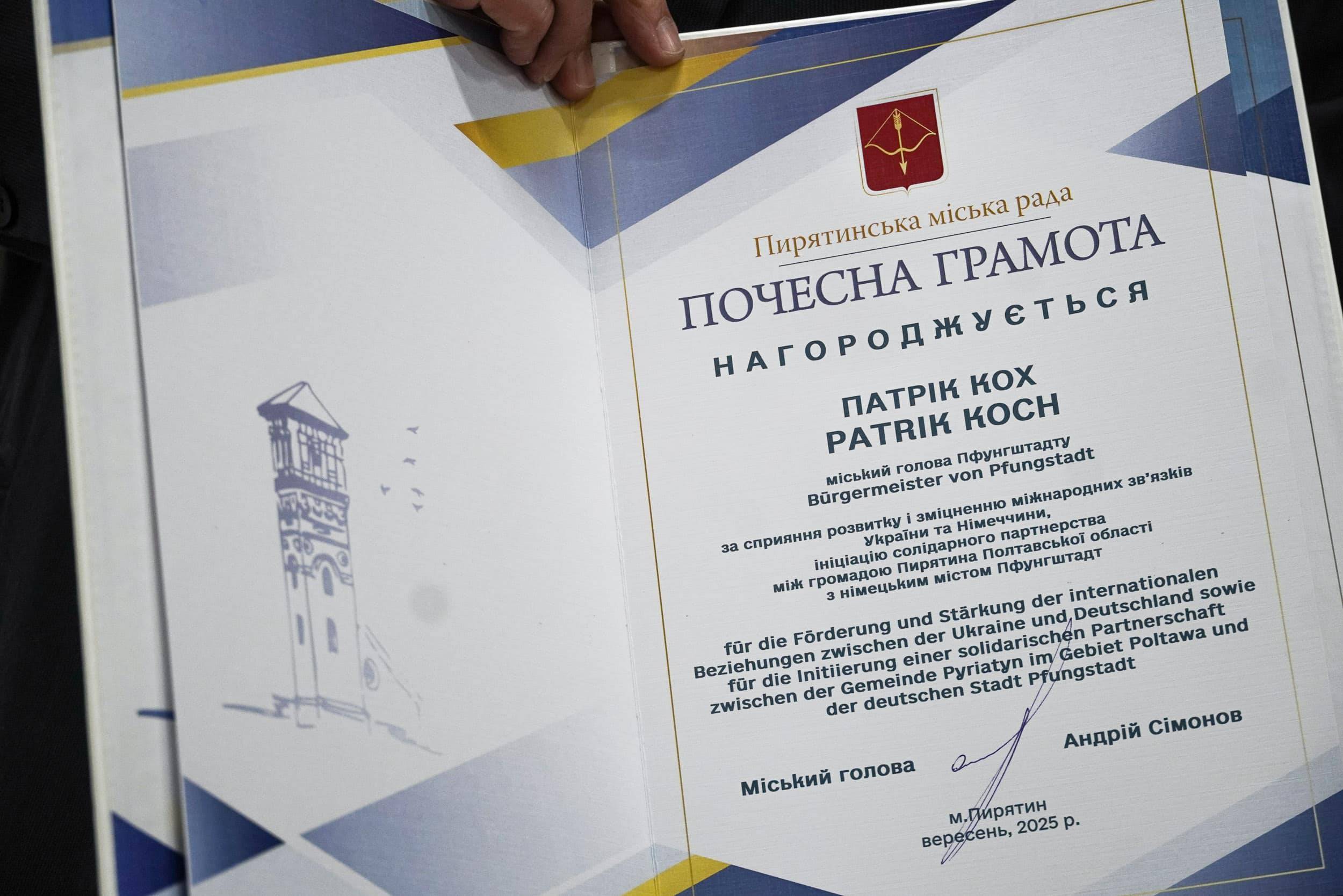 Угоду підписали Пирятинський міський голова Андрій Сімонов, мер міста Пфунгштадт Патрік Кох та секретар міської ради Олівер Хегеманн. Над цим партнерством працювали два роки: у листопаді 2024 року воно було одноголосно підтримано усіма фракціями депутатського корпусу Пфунгштадта, пріоритетними напрямами визначено медицину, соціальну сферу, енергетику та сталий розвиток. Організаційною підготовкою та подальшим супроводом партнерства займається заступниця голови правління PDUM e.V. Надія Костіна.