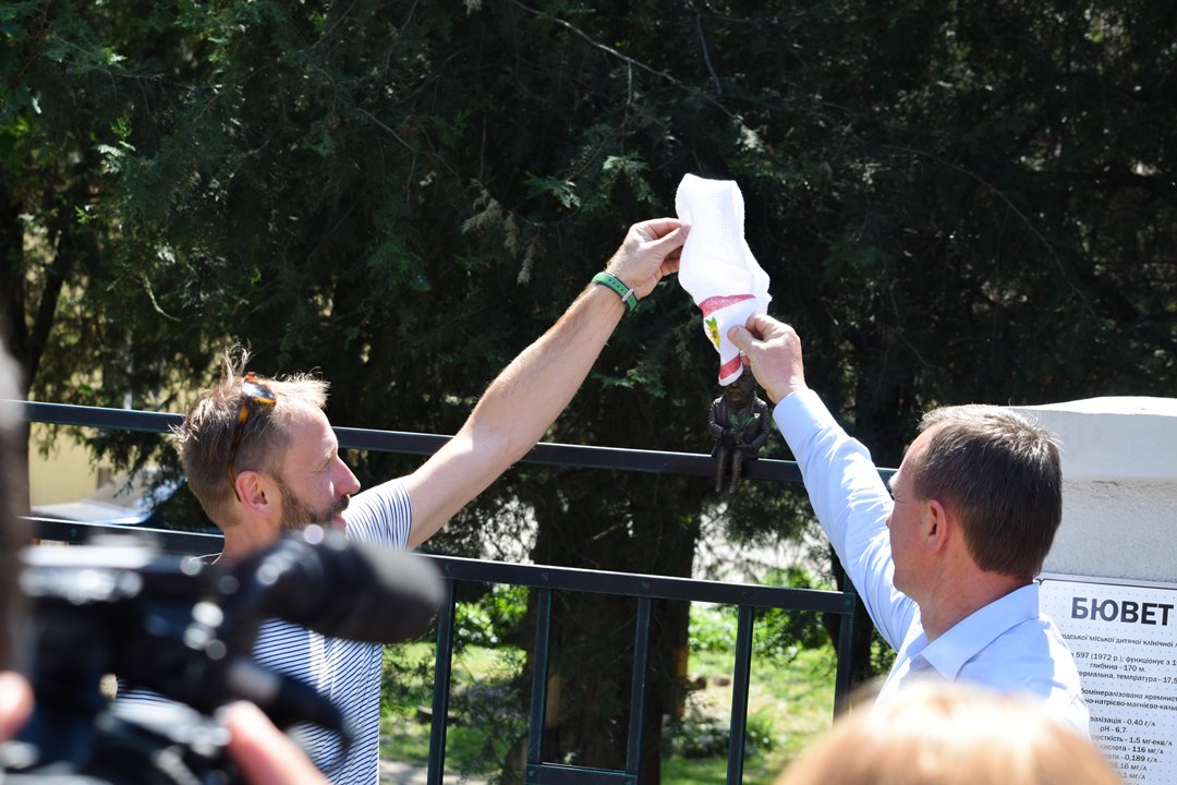 Відкрили скульптурку Іштвана Лаудона на огорожі парку – автор Михайло Колодко та міський голова Ужгорода Богдан Андріїв.