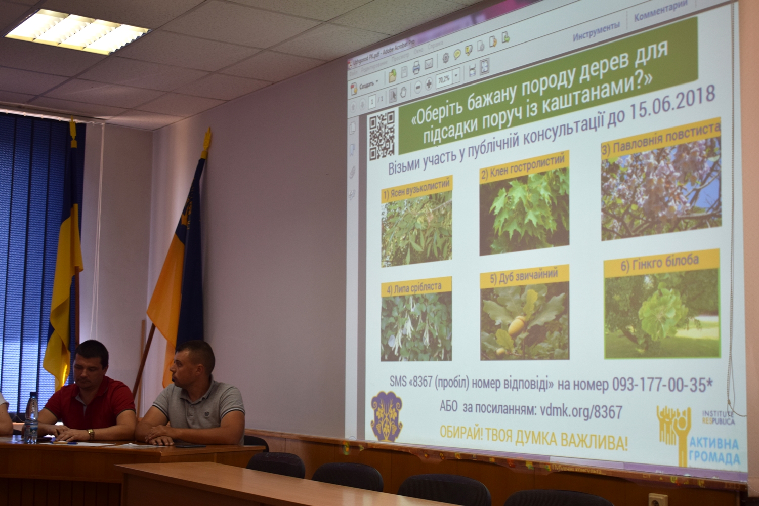 Радилися, яку ж проблему початково винести на громадські консультації і спільно визначили, що це каштани на Київській набережній, які вразила мінуюча міль і які у 2015 році почали кронувати ще за попередньої каденції: як бути з ними далі, чи підсаджувати між ними молоді дерева і якщо так, то які саме.