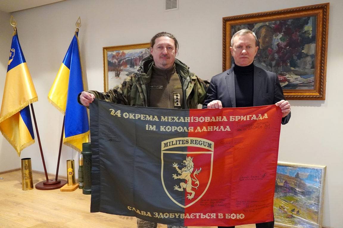 Прапор 24-ї окремої механізованої бригади імені короля Данила передали громаді Ужгорода як знак вдячності за підтримку військових
