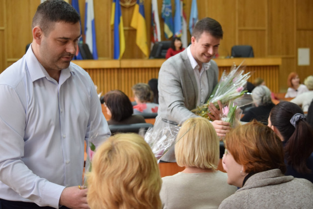 На завершення чоловіки вручили всім працівницям міської ради весняні квіти – тюльпани.