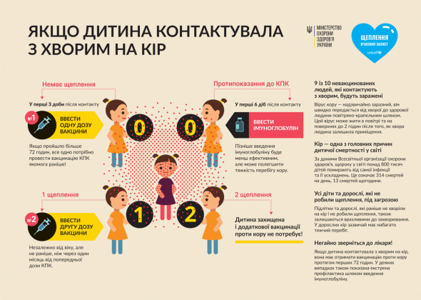 У разі контакту з хворим на кір негайно зверніться до лікаря. Якщо дитина контактувала з хворим на кір, вона має отримати вакцинацію проти кору протягом перших 72 годин. У деяких випадках також показана екстрена профілактика шляхом введення імуноглобуліну.