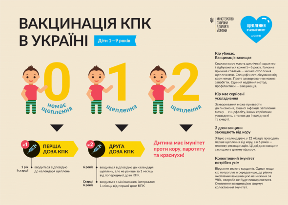 Вакцина проти кору входить до складу комбінованої трикомпонентної вакцини КПК (для профілактики кору, епідемічного паротиту, краснухи). Вакцини КПК містять живі атенуйовані (штучно ослаблені) віруси кору, паротиту і краснухи. Наразі в Україну для щеплень КПК постачають Пріорикс™/Priorix™ — препарат, вироблений компанією GlaxoSmithKline Biologicals s.a (Бельгія). Пріорикс — безпечна, ефективна та якісна вакцина, прекваліфікована ВООЗ — найавторитетнішою організацією у сфері охорони здоров’я у світі. Ці та інші вакцини, що входять до календаря щеплень, за угодою з МОЗ, за кошти державного бюджету закуповує Дитячий фонд ООН (ЮНІСЕФ). МОЗ України передає закуплені вакцини департаментам охорони здоров’я областей, а ті у свою чергу — державним медичним закладам, щоб громадяни України могли отримувати необхідні щеплення безкоштовно.
