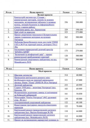 Протягом місяця з більш ніж семи десятків поданих ініціатив електронним голосуванням та бюлетенями, які можна було вкинути у скриньку в Центрі надання адміністративних послуг, ужгородці визначали проекти, які підтримують найбільше. Підрахунок голосів за кожен із проектів проводили 27 грудня.