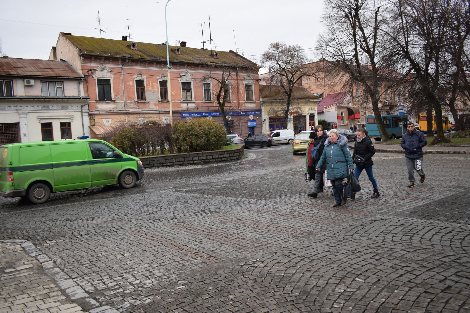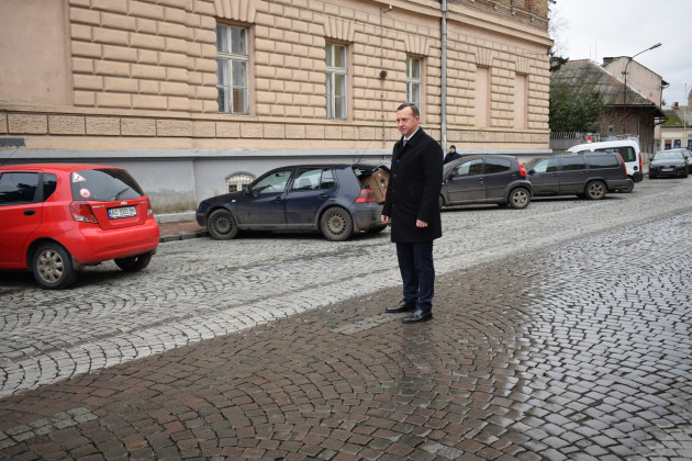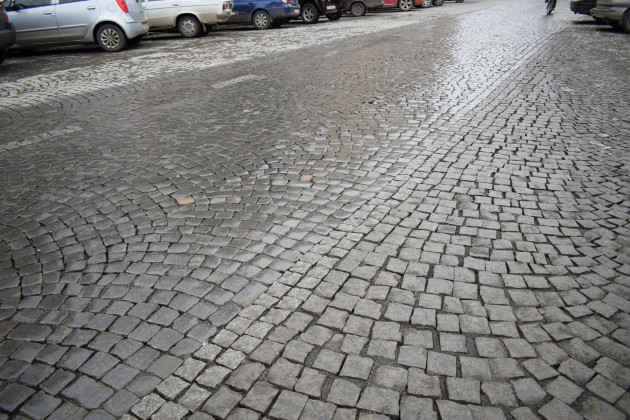 Із бруківки, яка дещо відрізняється кольором – сірої – виклали смуги дорожньої розмітки та на узбіччях смуги між місцями для паркування. Із червонуватої бруківки зробили також смуги на пішохідному переході.
