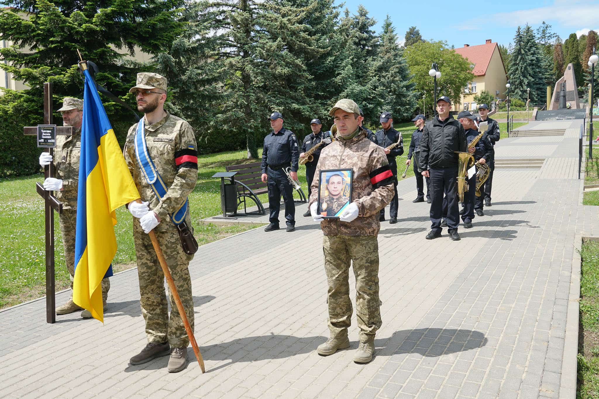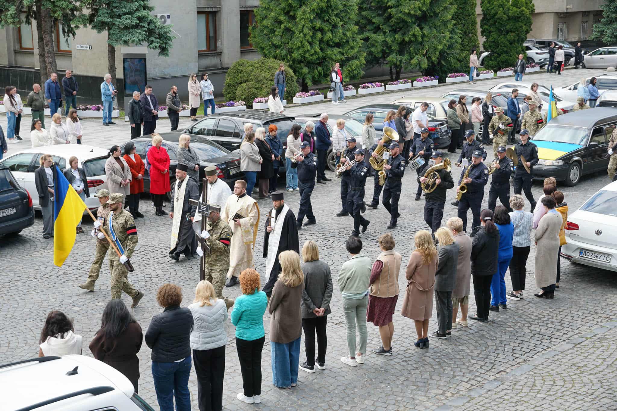 Прощалися з воїном на площі Народній. Віддати шану військовому прийшли рідні та близькі, міський голова Богдан Андріїв, військові, містяни.