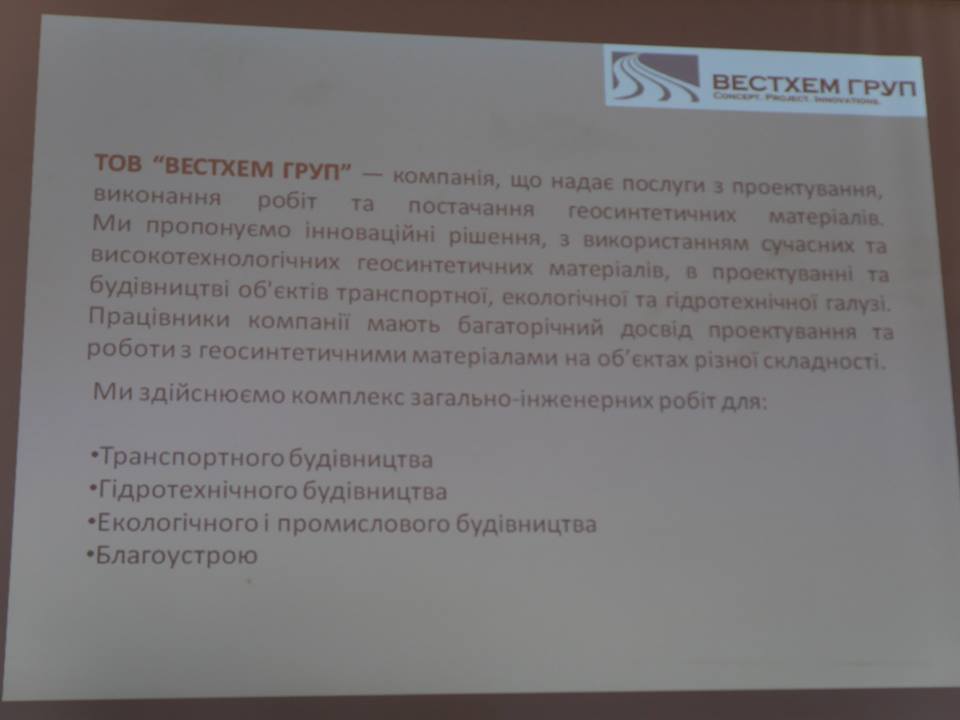 Сучасні геотехнічні матеріали і рішення з їх застосуванням презентували в Ужгородській міській раді представники ТОВ «Вестхем Груп». Компанія пропонує сучасні матеріали – геосітки, геотекстиль, геомати, геосоти, геомембрани, геотуби тощо. Вони використовуються для армування асфальтобетонних шарів, захисту схилів у гідротехнічних спорудах, злітних смугах аеропортів тощо. Наприклад, це решітки, сітки, які за кордоном вкладають у дорожнє покриття для міцності основи, геотекстиль, який не дає підніматися капілярній волозі, матеріали для дренажу та багато інших.