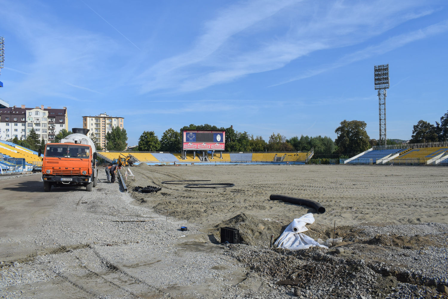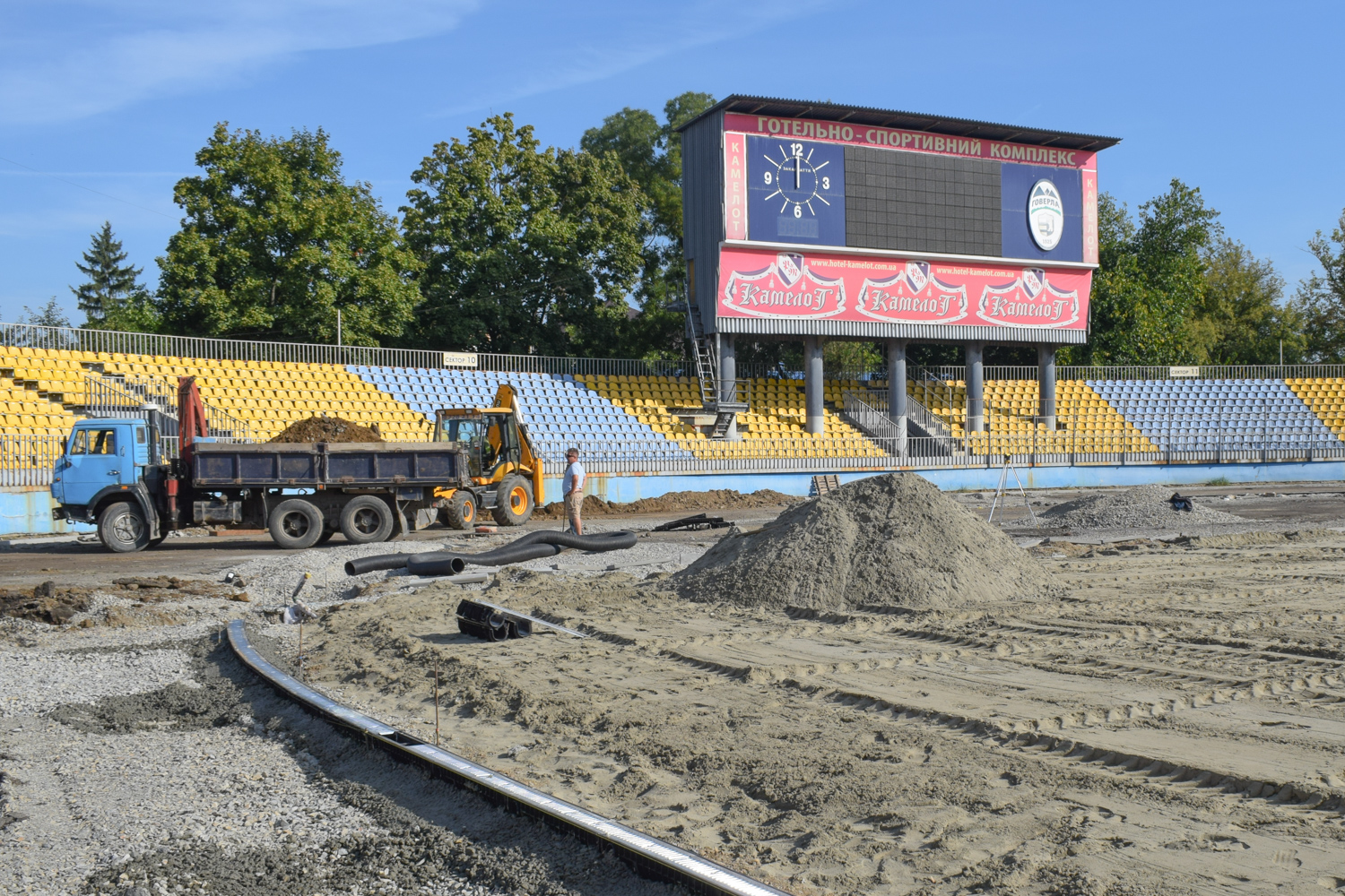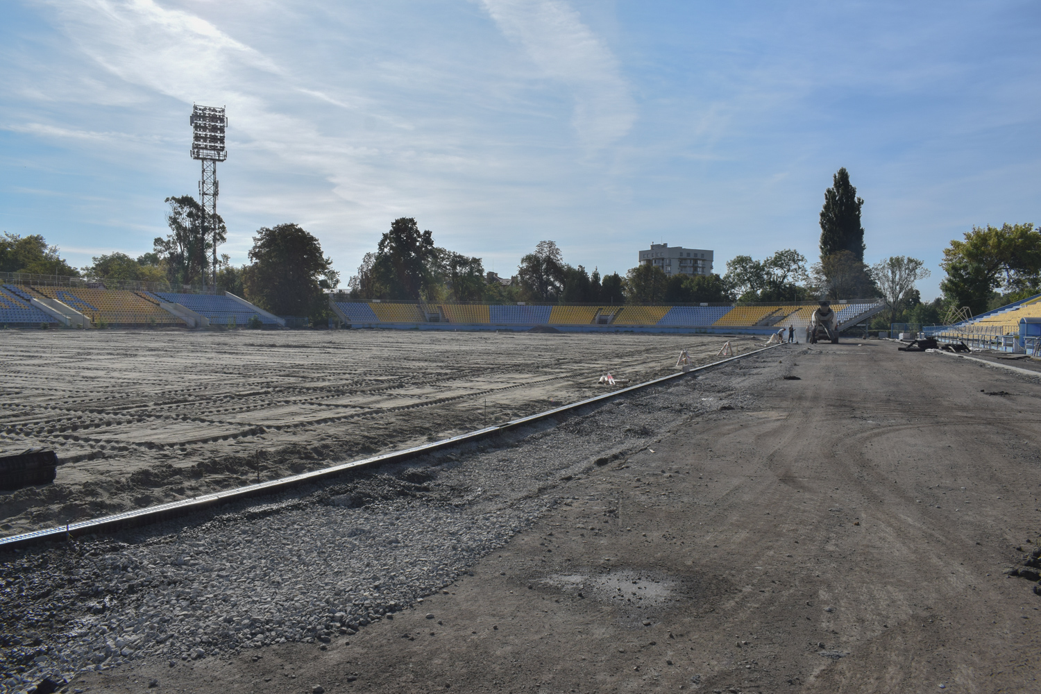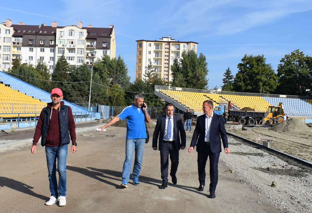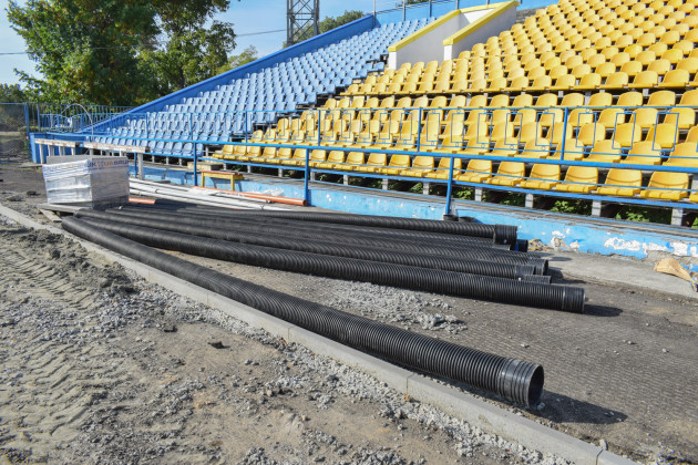 Наразі демонтували існуюче гумове покриття та асфальтну основу під ним, бетонні перешкоди та бетонне покриття, зробили нові системи канального водовідведення, встановили бордюри по периметру стадіону та обладнання для підведення комунікацій.