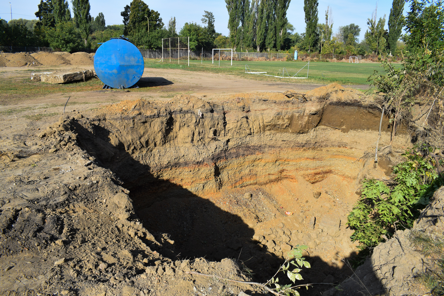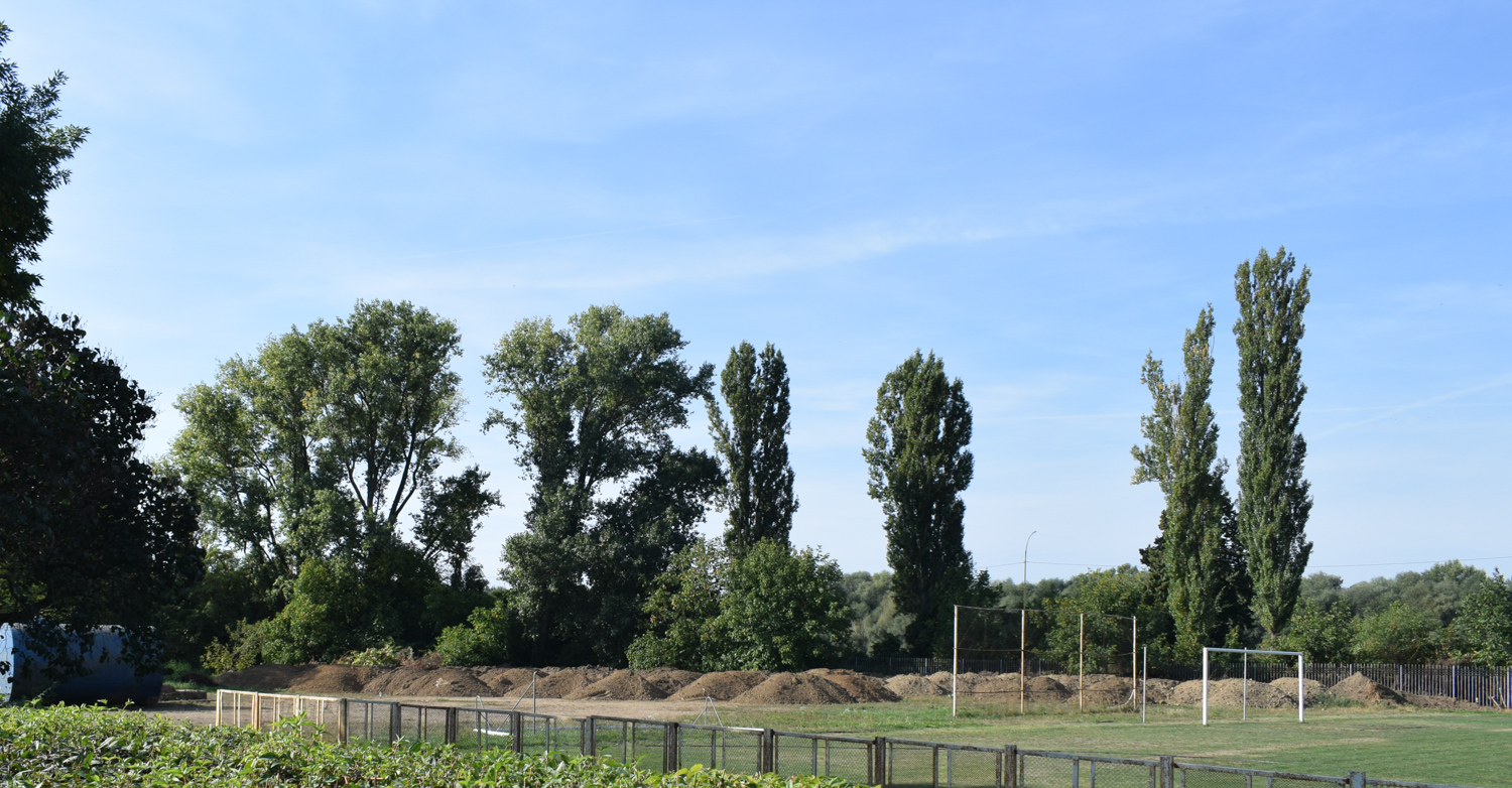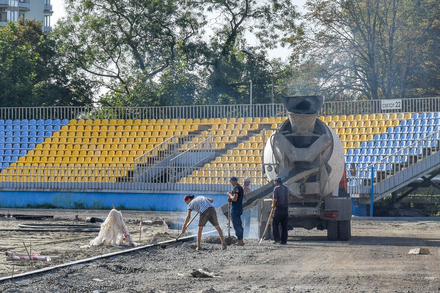 Наразі демонтували існуюче гумове покриття та асфальтну основу під ним, бетонні перешкоди та бетонне покриття, зробили нові системи канального водовідведення, встановили бордюри по периметру стадіону та обладнання для підведення комунікацій.