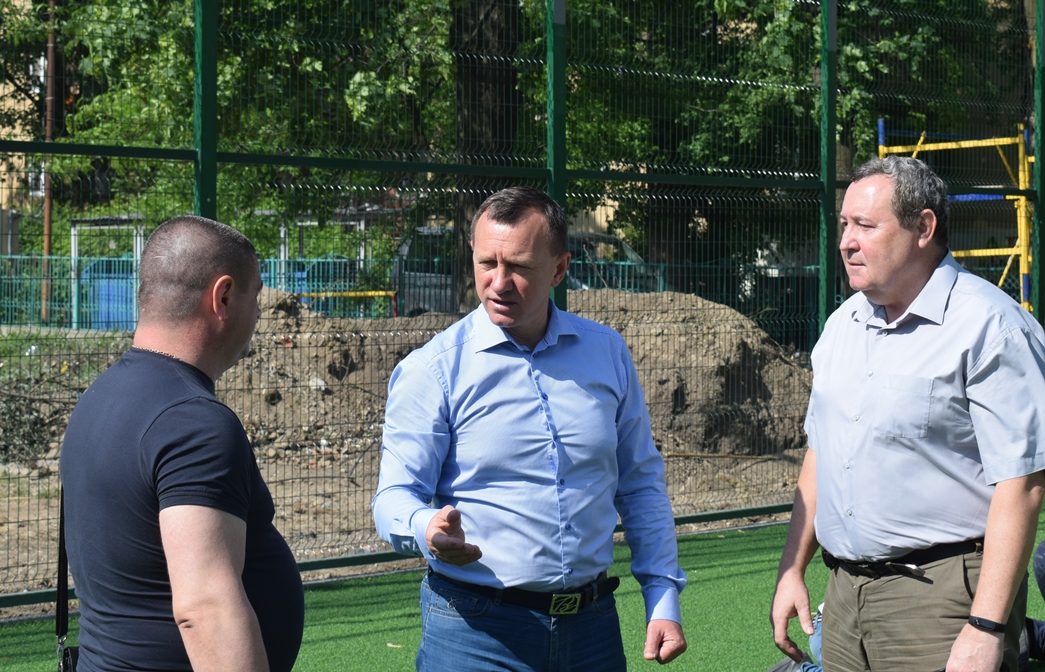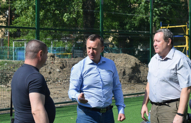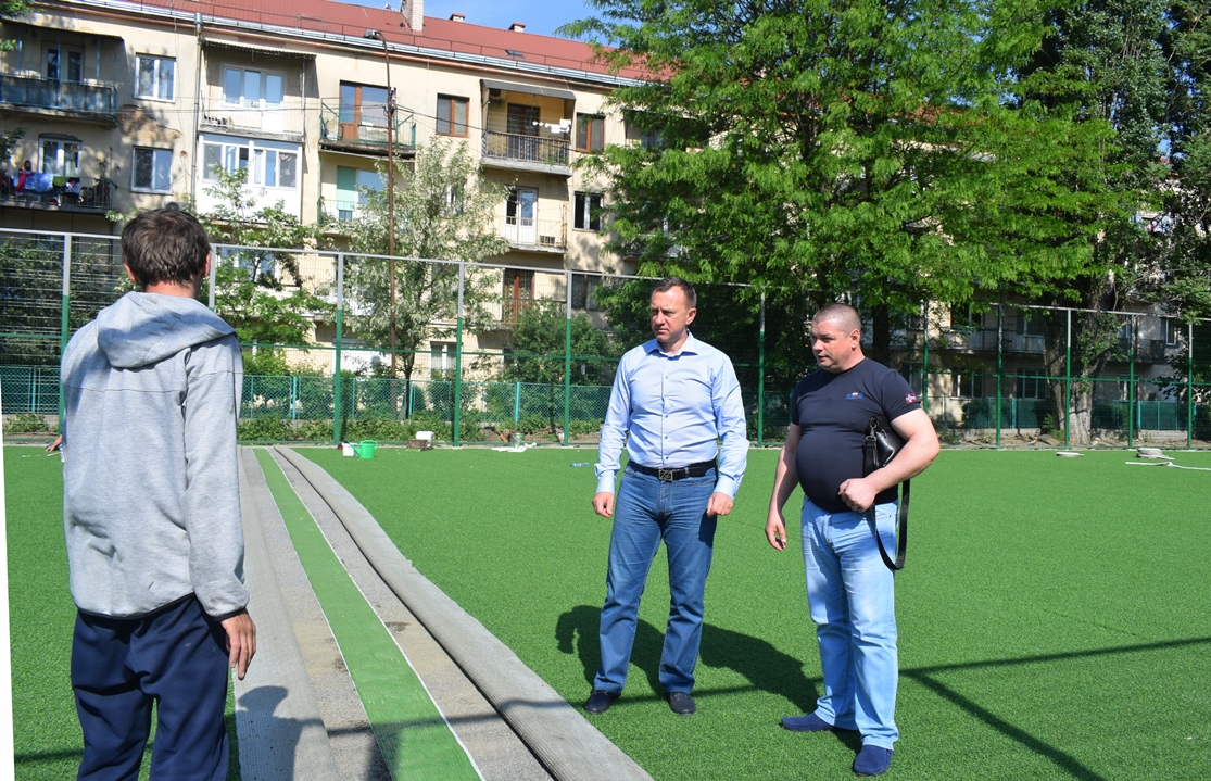 Ужгородський міський голова Богдан Андріїв оглянув сьогодні, як ідуть роботи зі встановлення футбольних міні-полів із штучним покриттям у двох школах міста – п’ятій та восьмій.