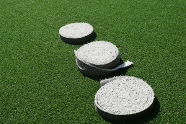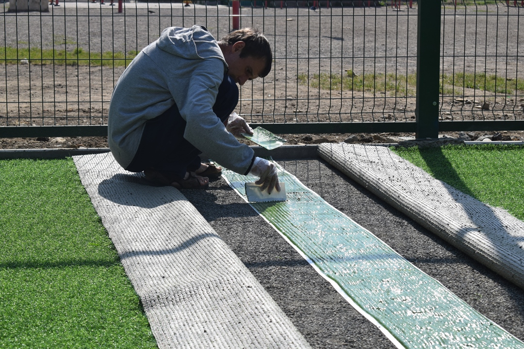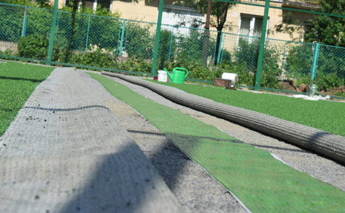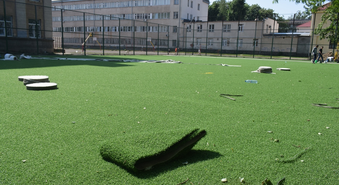 Облаштування поля на території Ужгородської спеціалізованої школи №5 з поглибленим вивченням іноземних мов уже завершується. Зараз працівники підрядної організації монтують штучне покриття, згодом нанесуть відповідну розмітку. У ЗОШ №8 готують основу під футбольне поле.
