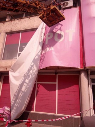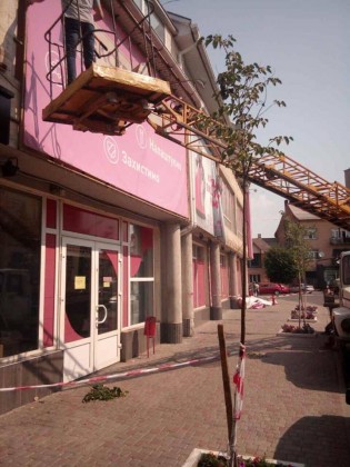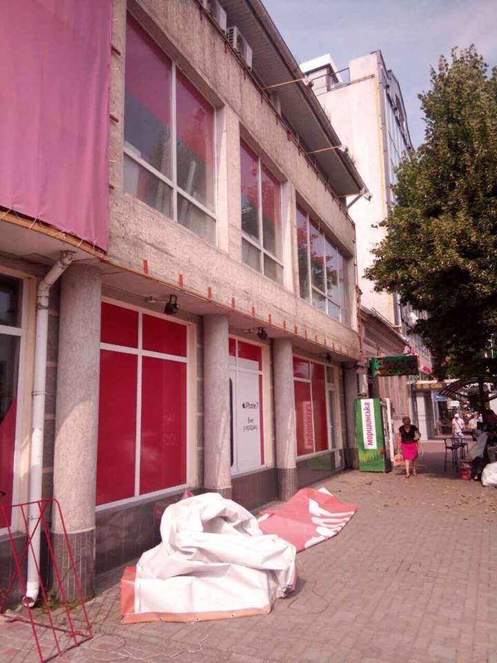 Чотири рекламні розтяжки вчора демонтували з фасаду магазину «Фокстрот» у центрі Ужгорода на розі вулиць Л.Тостого, Перемоги та площі Ш.Петефі.