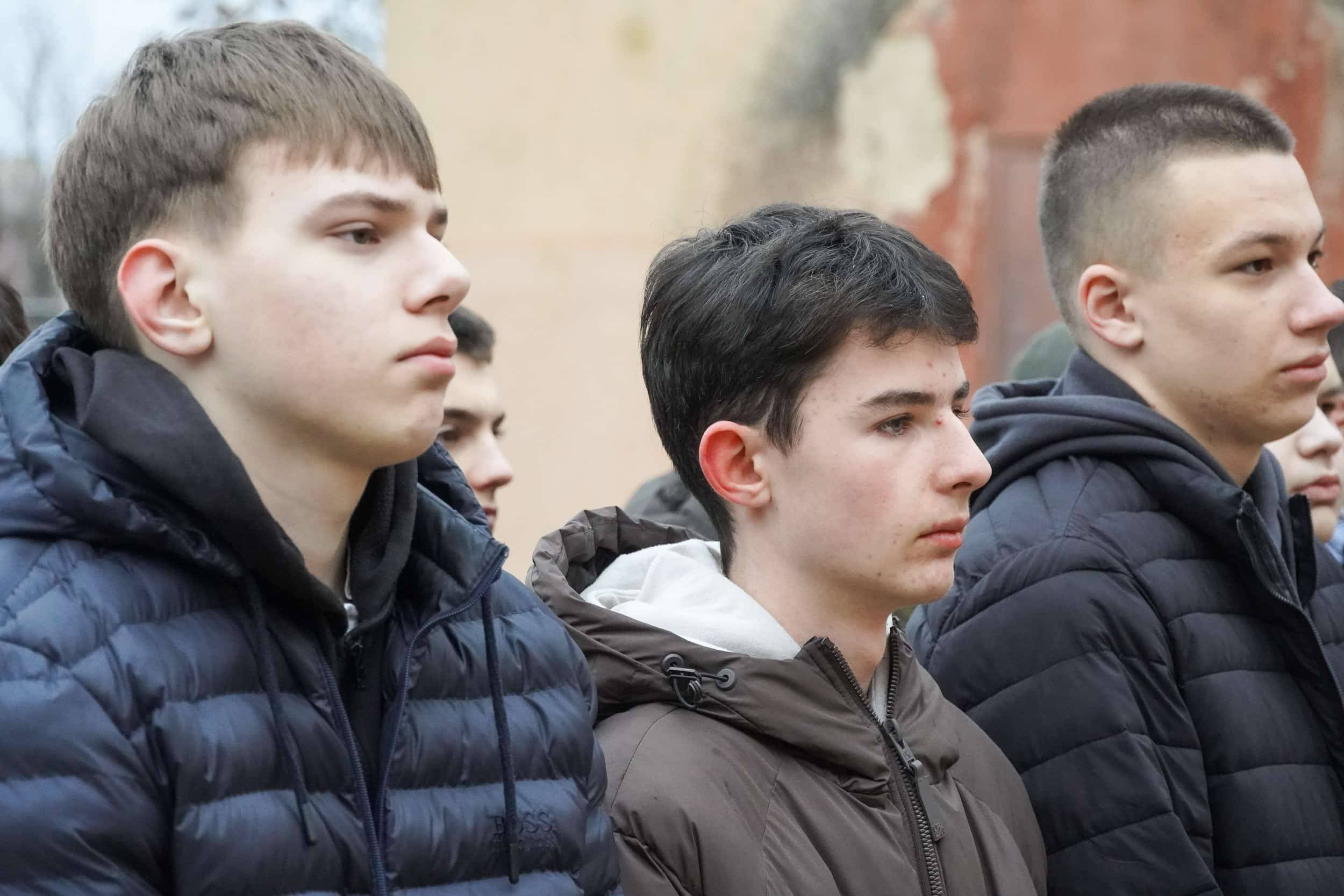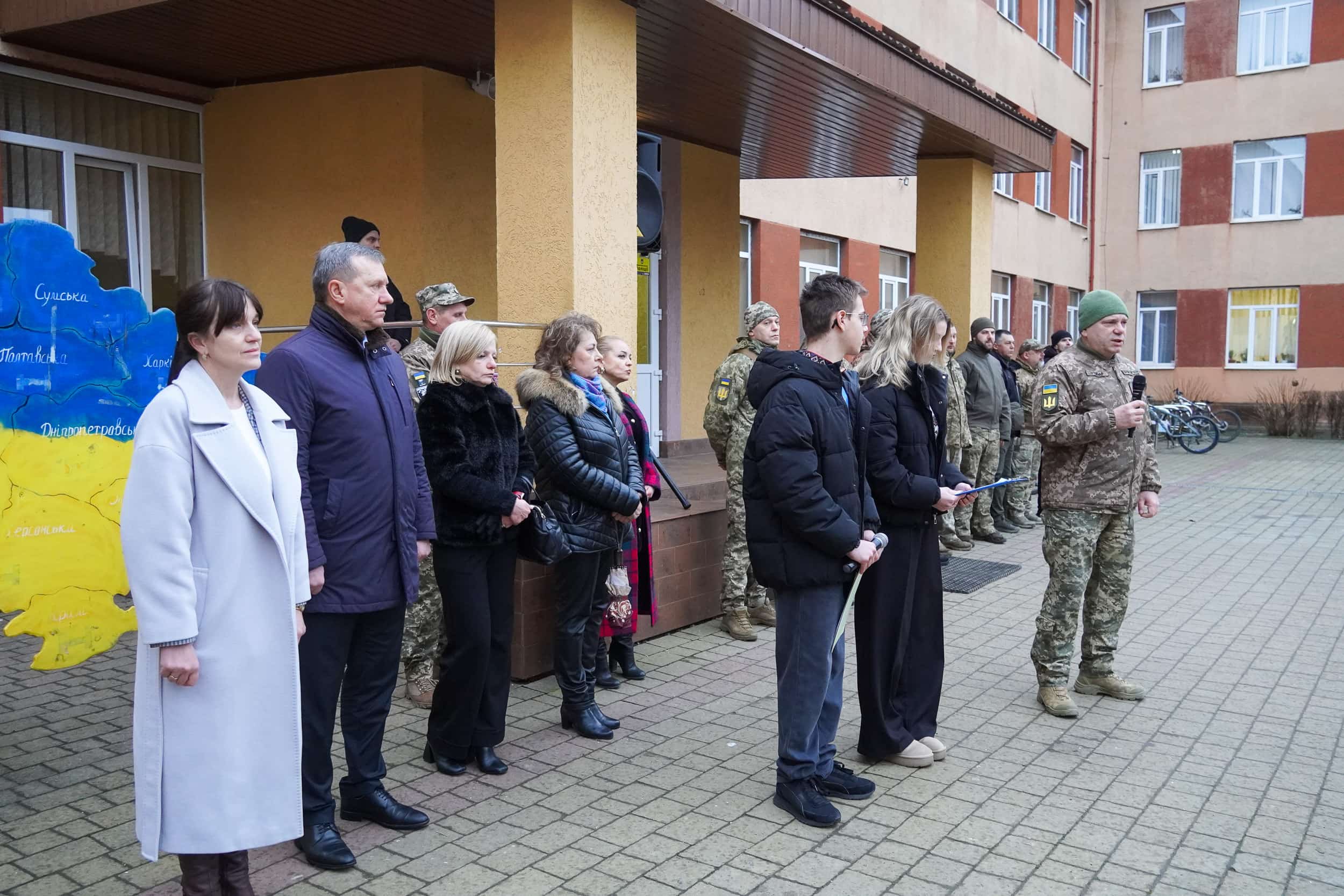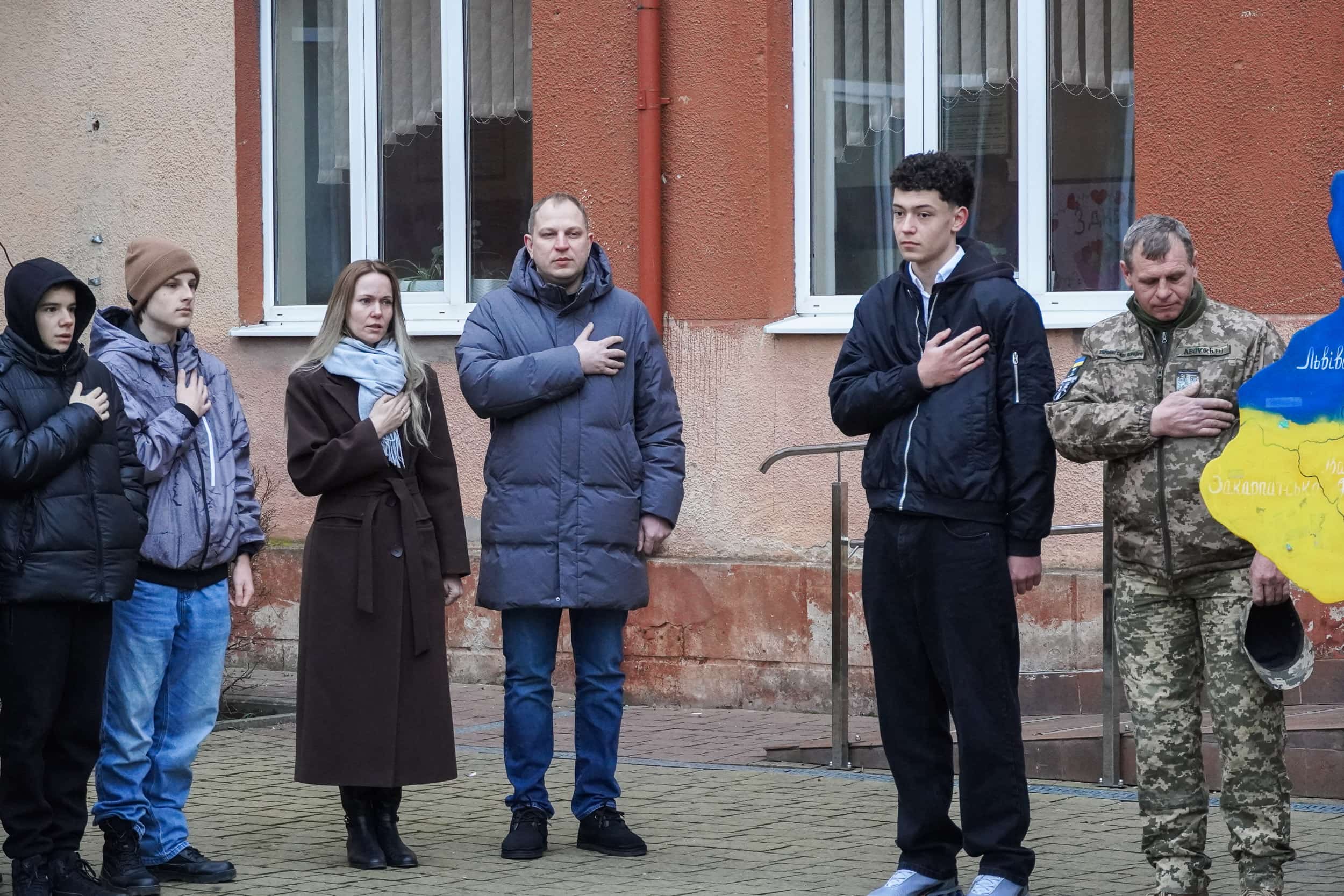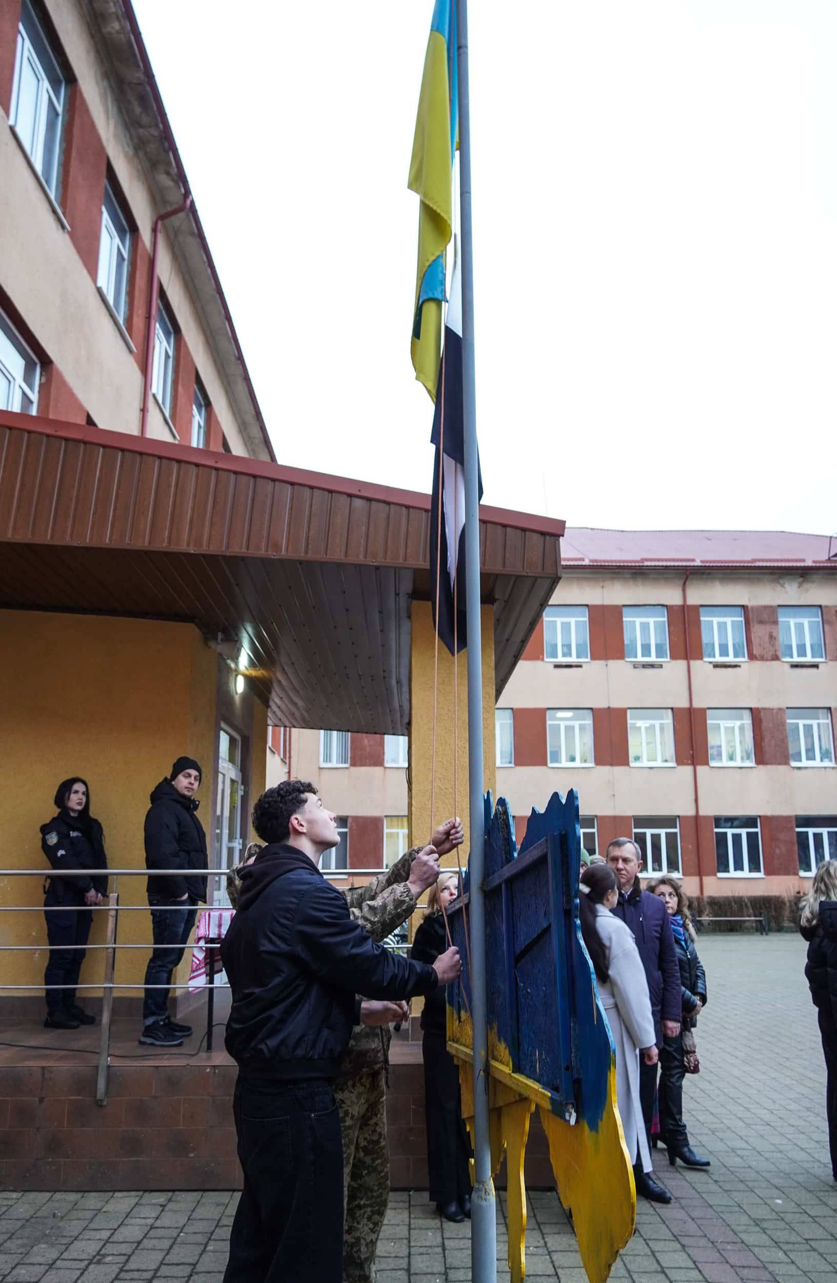 Символічним жестом стало підняття стяга сином військовослужбовця, учнем 11-Б класу Володимиром Обрезковим та ветераном російсько-української війни Михайлом Шум’яцьким.