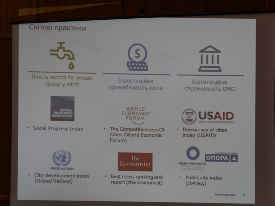 City Progress Index – інструмент, який допомагає визначати не просто певні показники у житті міст, а оцінити динаміку змін та їхню якість, відбувається прогрес чи регрес. Беруться до уваги параметри, на які безпосередньо можуть впливати мешканці та влада міста, проводиться оцінювання трьох блоків – якість життя та умов праці; спроможність органів місцевої влади, а також інвестиційна привабливість. Кожен із блоків оцінюється за кількома індикаторами, наприклад, якість життя визначається з огляду на безпеку міста, стан екології, ситуацію в освіті, медицині, культурі тощо, а діяльність влади оцінюється з урахуванням демократичності, передбачуваності дій, якості адміністрування процесів, ефективності використання ресурсів, підзвітності, прозорості влади тощо.