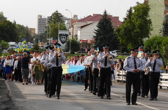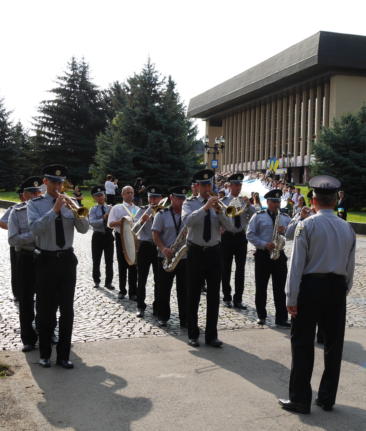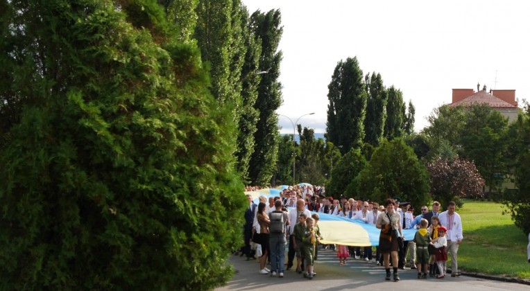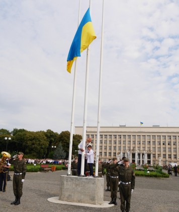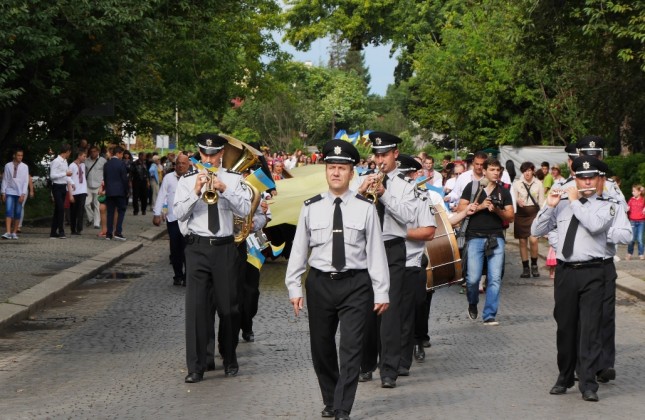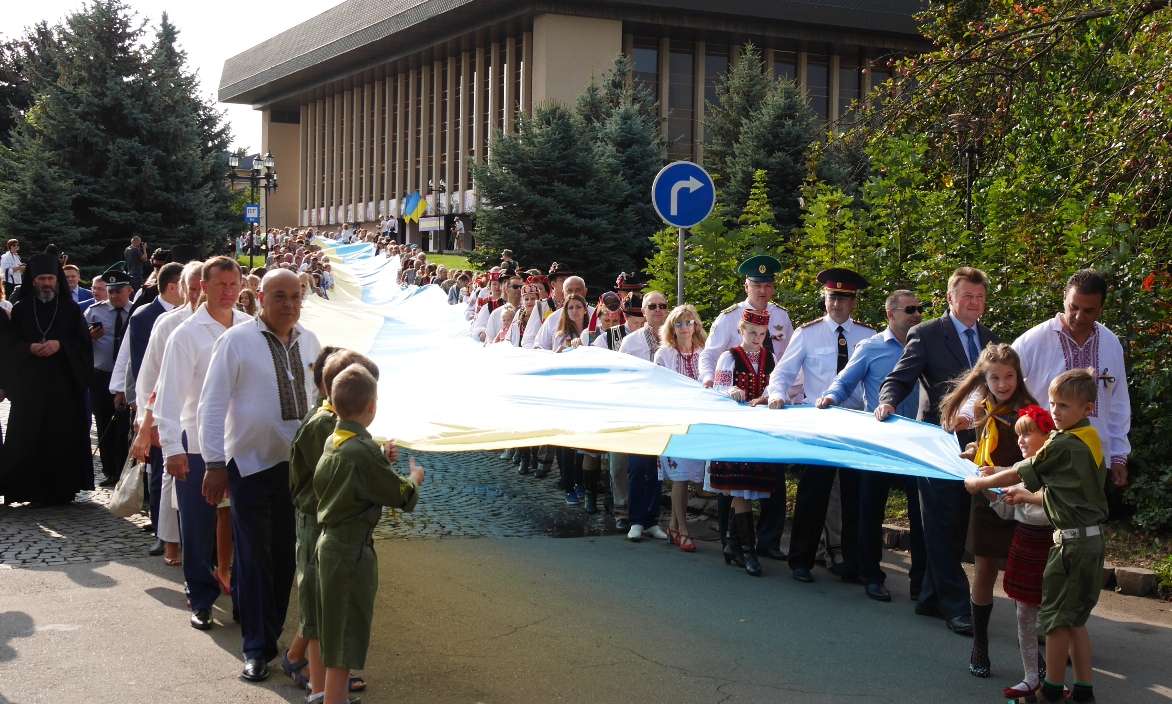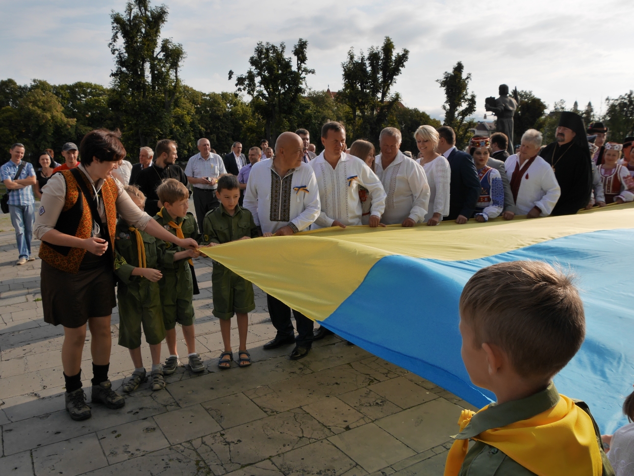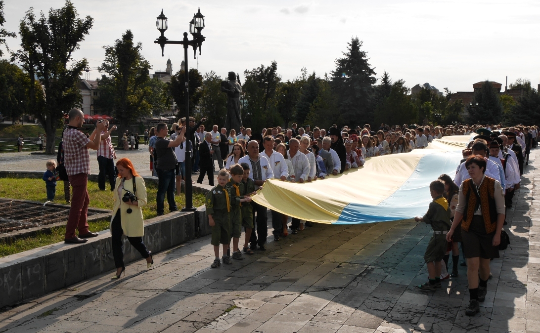 Сьогодні в обласному центрі Закарпаття синьо-жовтий прапор пронесли сотні людей – керівники області та міста, представники правоохоронних та силових структур, військовослужбовці, священики, діти-пластуни, молодь, артисти .