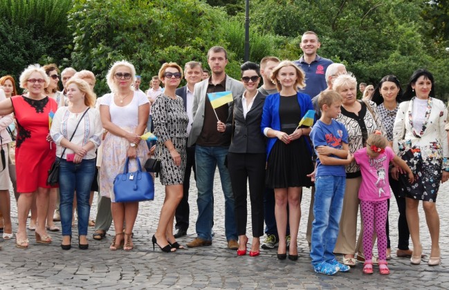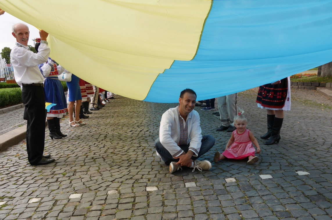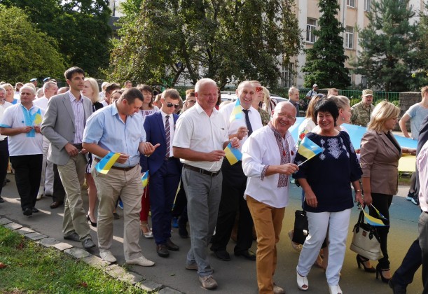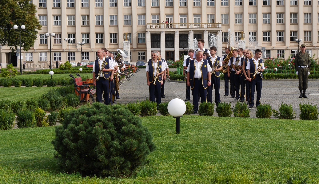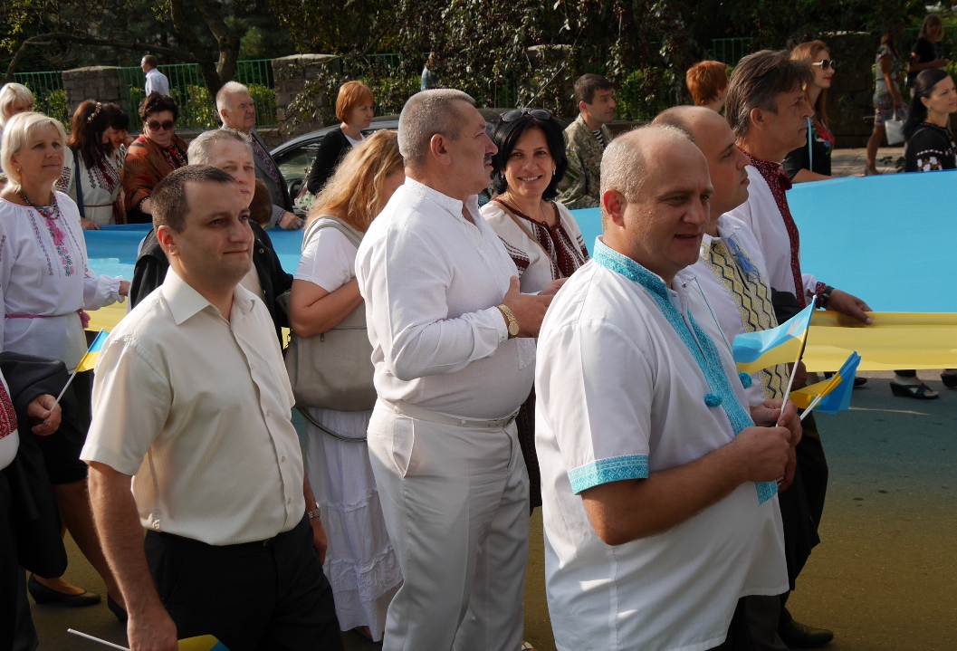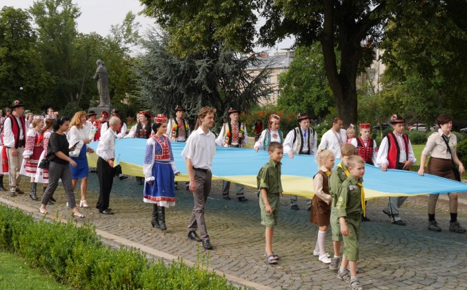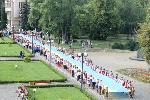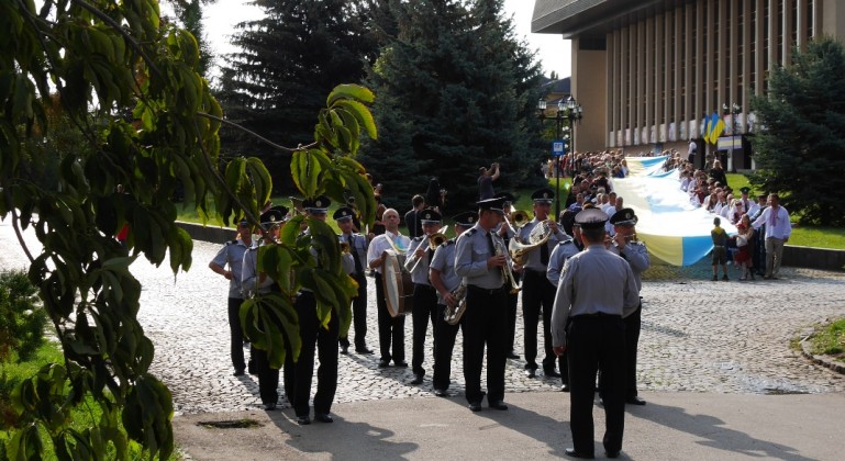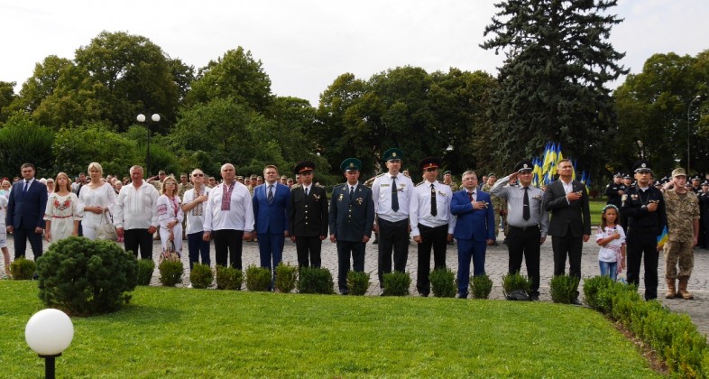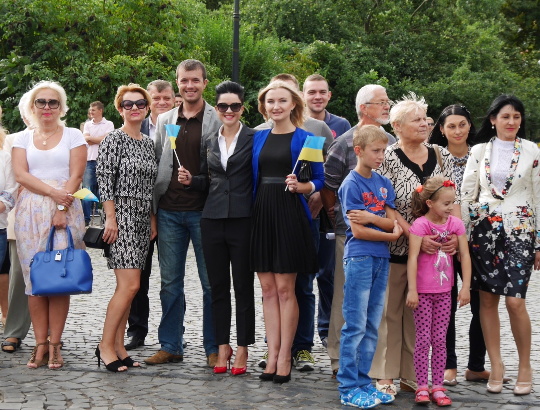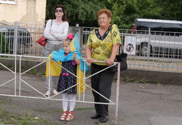 Сьогодні в обласному центрі Закарпаття синьо-жовтий прапор пронесли сотні людей – керівники області та міста, представники правоохоронних та силових структур, військовослужбовці, священики, діти-пластуни, молодь, артисти .