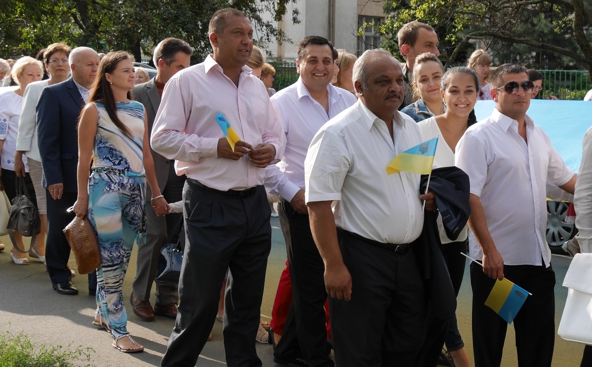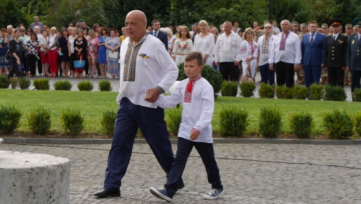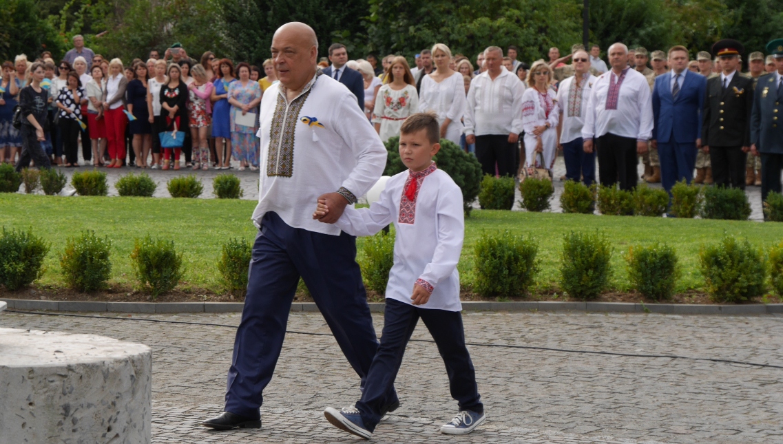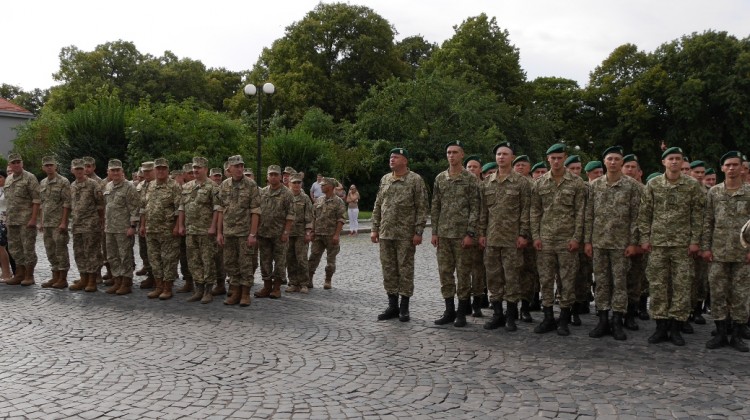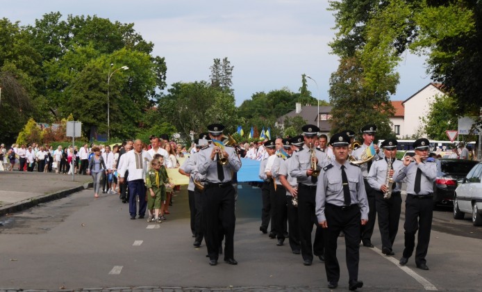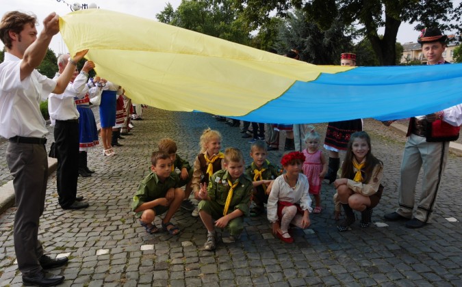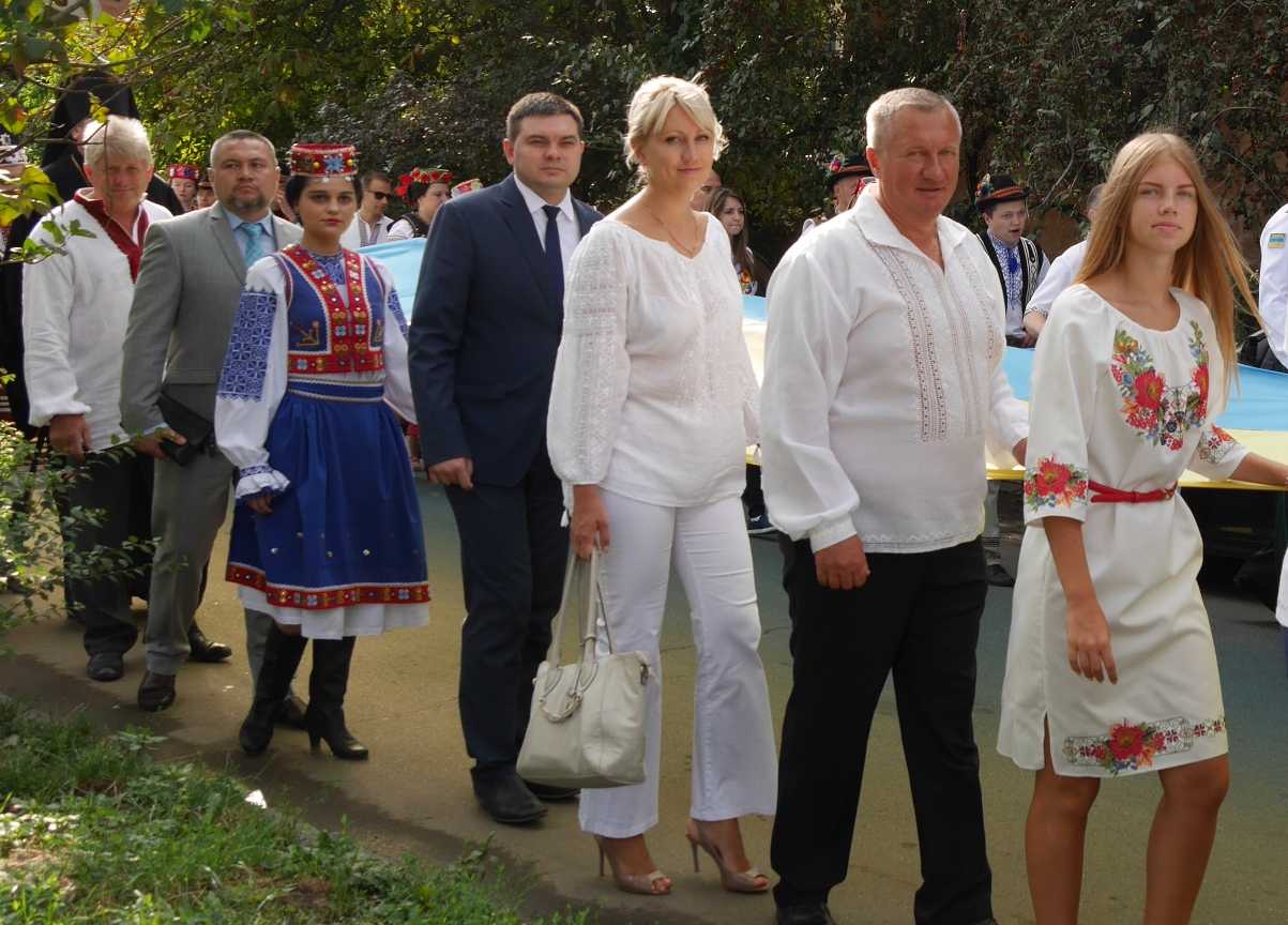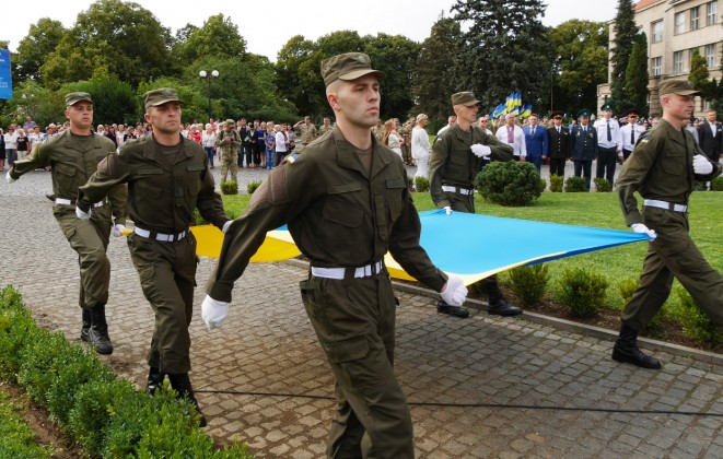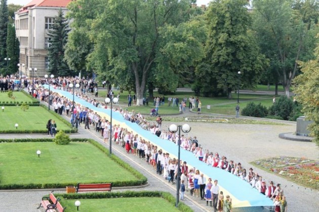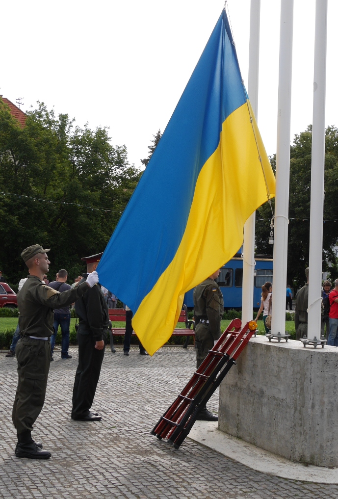 Сьогодні в обласному центрі Закарпаття синьо-жовтий прапор пронесли сотні людей – керівники області та міста, представники правоохоронних та силових структур, військовослужбовці, священики, діти-пластуни, молодь, артисти .