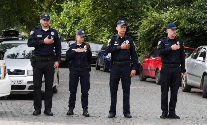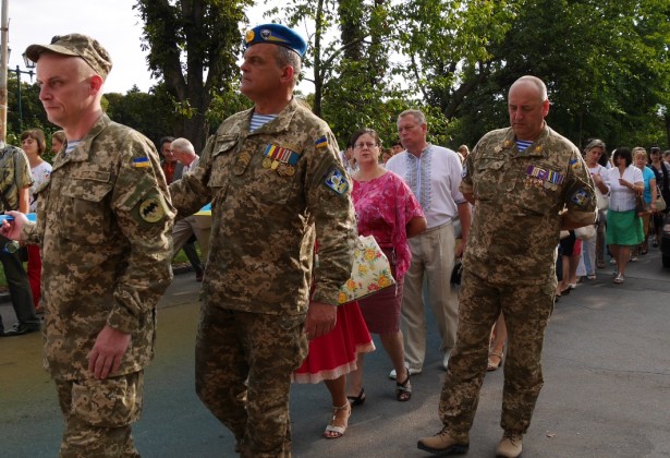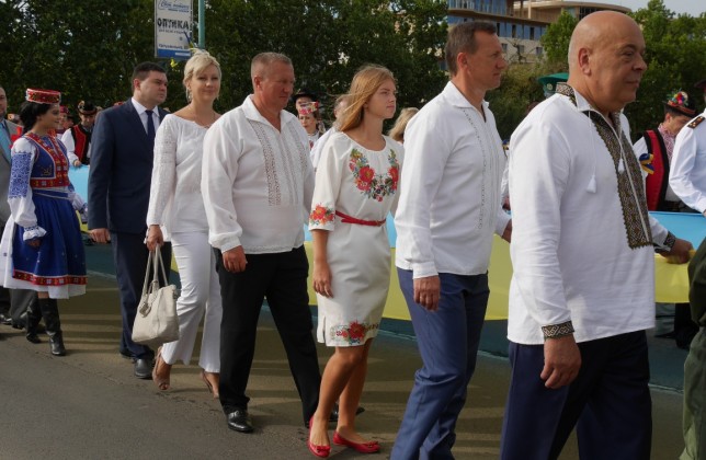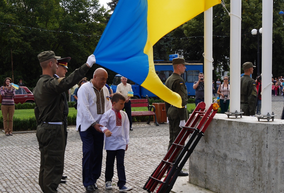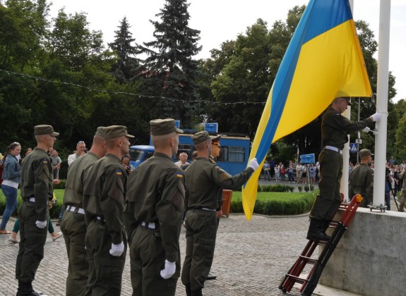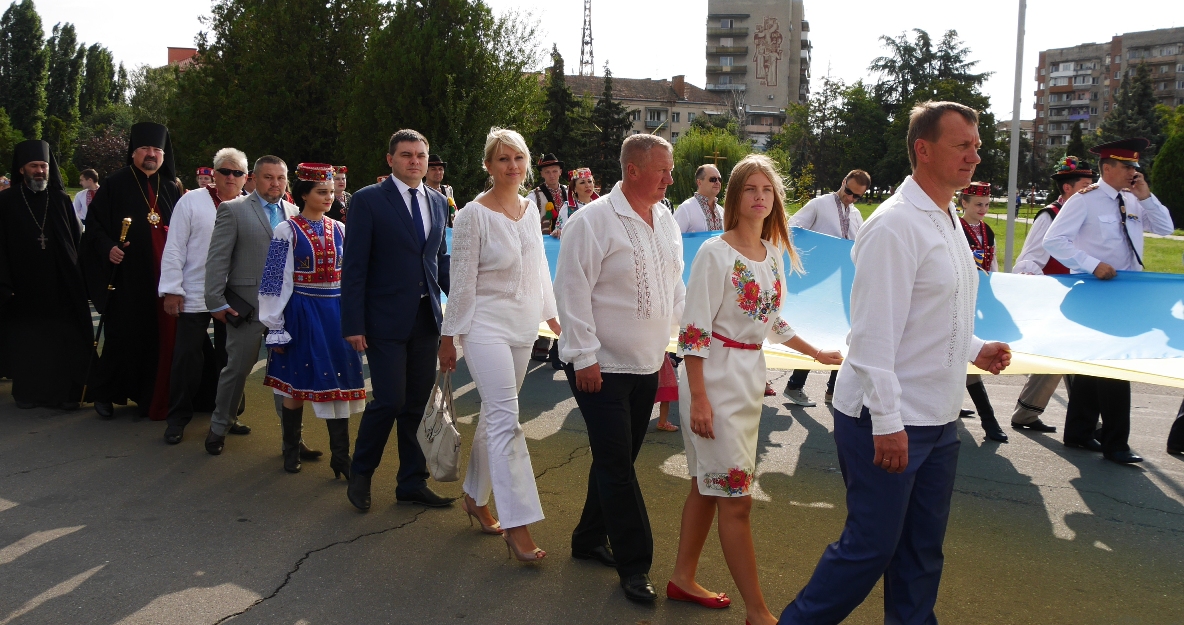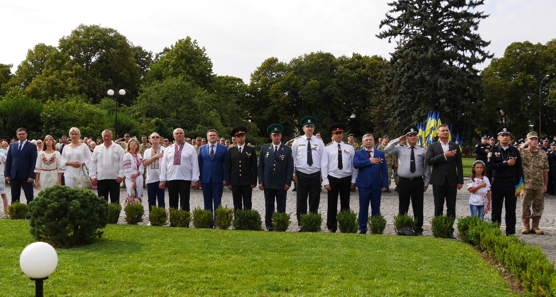 Розпочали ходу від обласного муздрамтеатру, пройшли Київською набережною, далі через транспортний міст Масарика і до площі Народної. Там відбувся парад за участі офіцерів Нацполіції, патрульної поліції, прикордонників, спецпідрозділів. Опісля голова ОДА Геннадій Москаль разом із сином загиблого прапорщика Олега Реготуна Тарасом підняли Державний Прапор України.